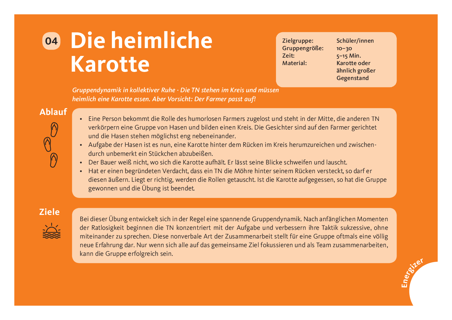 Bei dieser Übung versucht sich die Gruppe nicht nur stillschweigend an der gemeinsamen Herausforderung, sie hält teilweise noch nicht einmal Blickkontakt untereinander, da die Aufgabe auch dann gemeistert werden kann, wenn man gewissermaßen nur auf haptischer Ebene miteinander agiert und kommuniziert. Die Rolle des Farmers bietet im Anschluss an die Übung eine gute Diskussionsbasis: Er tritt als Einzelperson gegen den Rest der Gruppe an und steht zudem auch noch in der Mitte eines Kreises, gleichzeitig hat er jedoch die mächtigste Rolle inne. Wie fühlen sich die Machtverhältnisse an? Gibt es ein Machtgefälle? Was fühlt der TN mit der heimlichen Karotte bei gleichzeitig bohrendem Blick des Farmers?