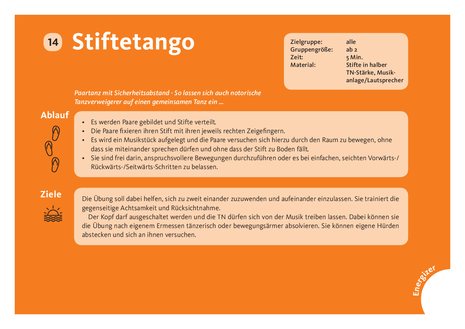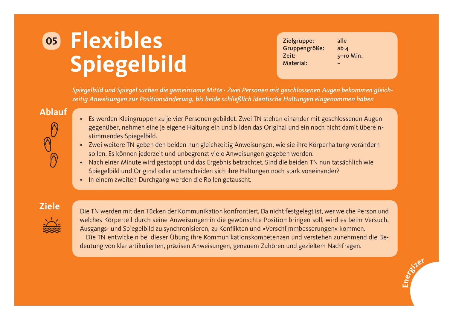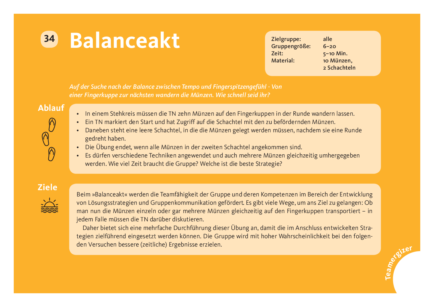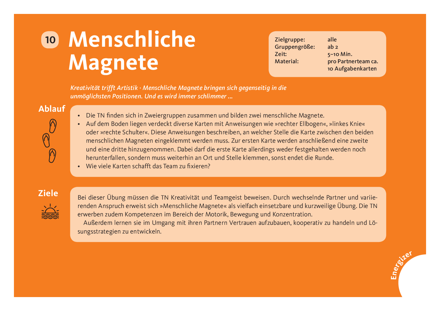 Bei dieser Übung werden Zweierteams vor ungewöhnliche Aufgaben gestellt, die sich im Anschluss diskutieren lassen. Das Wiederholen dieses »Energizers« und das langsame Herantasten an die besten Lösungsstrategien dienen als Vergleich für die alltägliche Bewältigung von Aufgaben bei der Arbeit oder in der Schule. Im Team muss man sich aufeinander einlassen und schrittweise die Komplexität der gemeinsam zu bewältigenden Aufgaben steigern, um sich fortwährend verbessern zu können. Die Übung verdeutlicht außerdem auf äußerst plastische Weise, wie sehr wir in vielen Lebenssituationen miteinander verbunden sind oder in wechselseitiger Abhängigkeit zu- und voneinander stehen. Dies geht in Zeiten zunehmender Globalisierung und Digitalisierung zuweilen unter. Insofern kann die Übung den Teilnehmenden sehr anschaulich verdeutlichen, wie schwierig es sein kann, von Angesicht zu Angesicht eine Aufgabe zu bewältigen, und wie erhebend und verbindend es gleichzeitig ist, wenn einem dies letztlich gelingt.