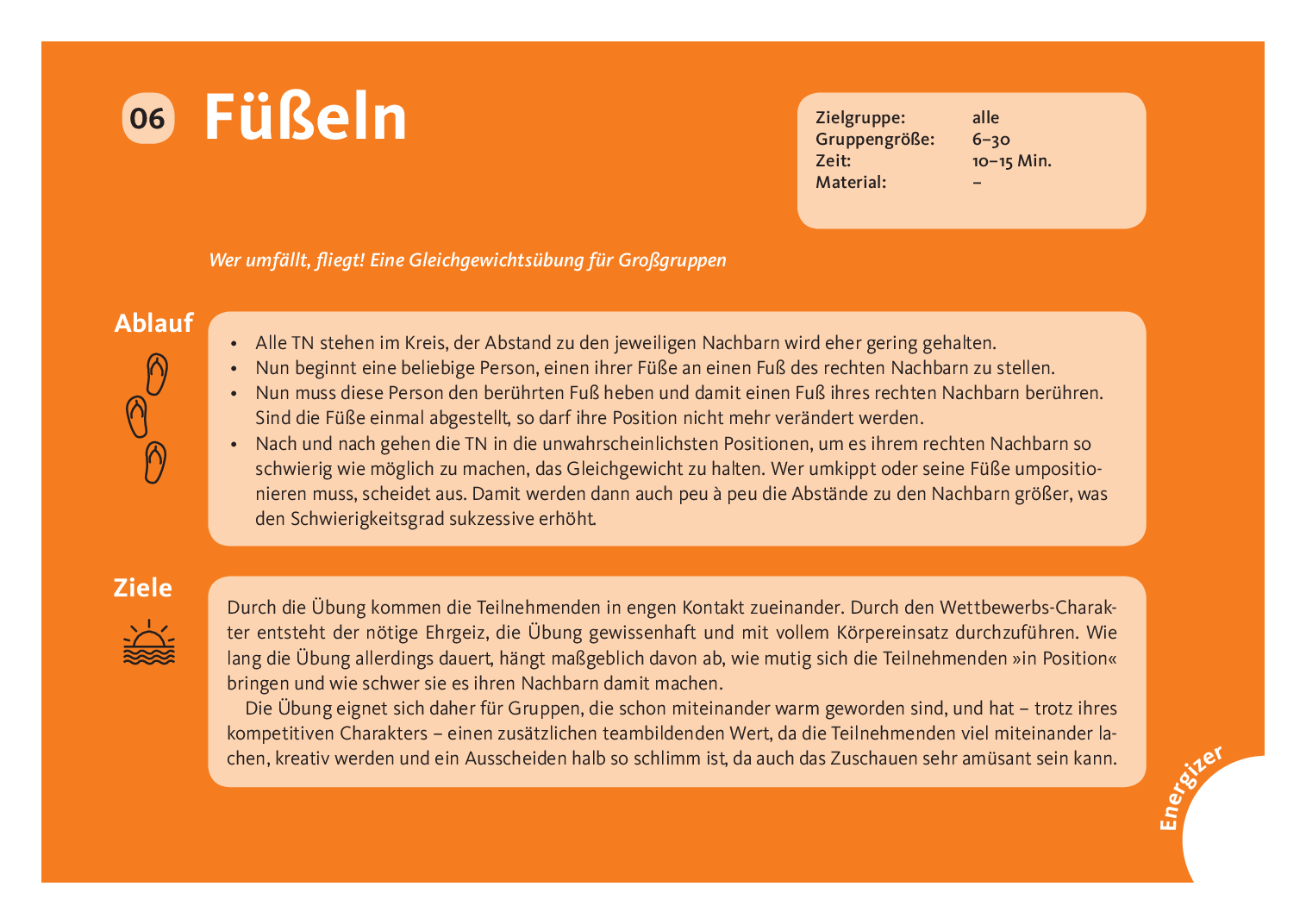Füßeln ist vornehmlich als »Energizer« einzusetzen. Die TN bewegen sich, lachen viel und werden kognitiv entlastet. Man benötigt ausreichend Freiraum für einen großen Stehkreis und genügend Zeit für die Erklärung, gegebenenfalls einen Probedurchlauf und die eigentliche Durchführung. Anschließend lässt sich gemeinsam reflektieren, wie die einzelnen Strategien aussahen, wer es eher darauf angelegt hat, seine Nachbarn ins Wanken zu bringen, und wer mehr darauf bedacht war, selbst einigermaßen stabil zu stehen. Manche TN entwickeln auch eine »falsche Solidarität« für ihren rechten Nachbarn und bieten ihm immer wieder die Möglichkeit, den Standfuß in eine bequemere und stabilere Position zu bringen – vielleicht in der Hoffnung, dass ihr linker Nachbar vergleichbar gnädig mit ihnen umgehen wird. Es kann interessant sein, sich darüber auszutauschen, was in den Köpfen der einzelnen TN vorgegangen ist und was sie dazu veranlasst hat, diese oder jene Strategie zu fahren oder gegebenenfalls auch im Laufe der Übung irgendwann zu wechseln, wann sie mutiger geworden sind etc.