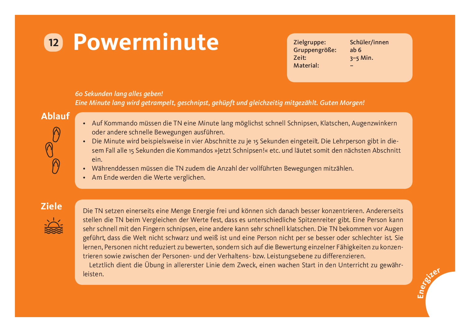 Die Powerminute kann zu verschiedenen Zwecken eingesetzt werden. So eignet sich dieser »Energizer« beispielsweise besonders gut, um verhaltensoriginelle jüngere Kinder auszupowern oder um ältere TN aufzuwecken. Die Art und Weise der Durchführung ist dabei völlig flexibel in Zeit und Komplexität. Prinzipiell kann sie auch als Einheit im Sportunterricht oder als Spiel auf dem Pausenhof eingesetzt werden. Übungen mit Klatschen und Schnipsen eignen sich jedoch generell eher für jüngere TN. Die Reflexionsmöglichkeiten im Nachgang an diese Übung sind etwas begrenzter als bei anderen »Energizern«. Dennoch kann man mithilfe dieser Übung sein persönliches (motorisches) Leistungsprofil diagnostizieren, kann die Gruppe reflektieren, aus welchen Gründen manche besonders engagiert zu Werke gegangen sind und andere die Übung eher über sich haben ergehen lassen, und kann gemeinsam festgestellt werden, ob es auch hierbei bestimmte Erfolgsstrategien oder Hindernisse gab.