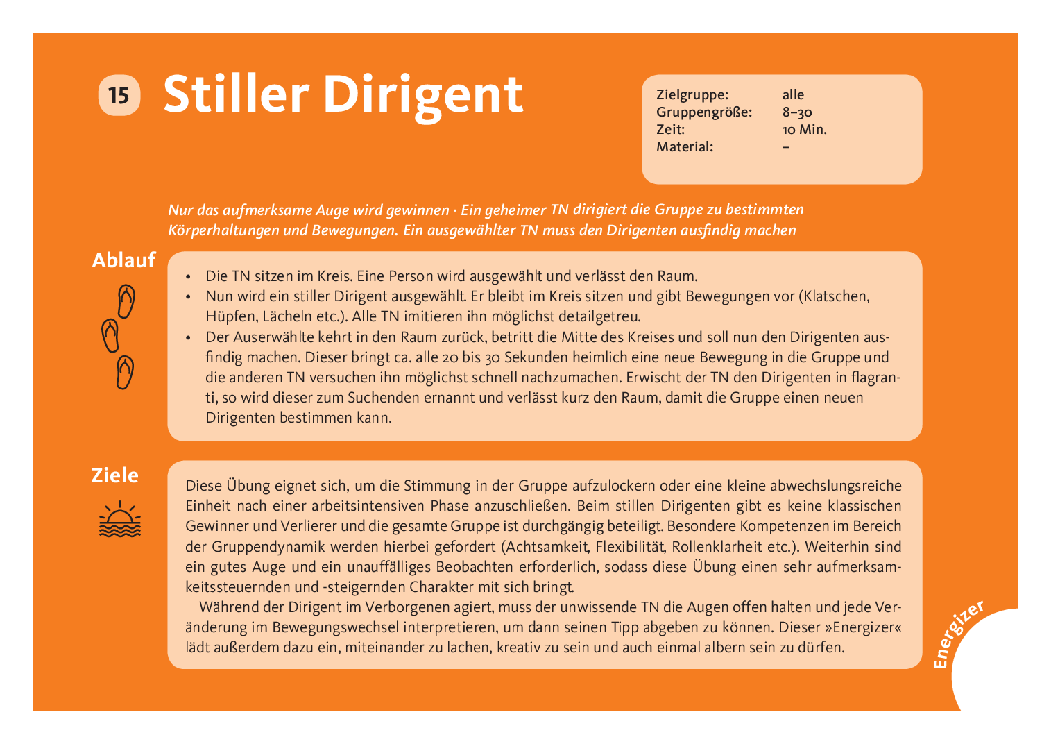 Bei jüngeren Teilnehmenden kann es sinnvoll sein, im Nachgang an die Übung über die aufgetretenen Erfolgsstrategien zu sprechen: Der Dirigent versucht normalerweise seine Bewegung dann einzuführen, wenn der TN mit dem Rücken zu ihm steht. Kommt eine neue Bewegung ins Spiel, steht der Dirigent also bestenfalls nicht direkt im Sichtfeld des ratenden Teilnehmers. Die anderen TN versuchen den Dirigenten unaufällig zu beobachten. Ihren Augen zu folgen könnte hilfreich sein. Mithilfe dieser Übung lässt sich über den Aspekt der Selbstwirksamkeit reflektieren: Inwieweit hat das persönliche Verhalten als TN zum (Miss-)Erfolg beigetragen? Wie hat sich der Dirigent gefühlt, als er quasi auf Knopfdruck die Befugnis erhielt, die Bewegungen der gesamten Gruppe vorzugeben? Wie »mutig« war der Dirigent in seinen Vorgaben (vom unauffälligen Nicken oder Lächeln bis hin zum riskanten Hüpfen oder Hinlegen)? Und wie war es für den ratenden TN, als einzig Uninformierter in der Runde zu stehen?