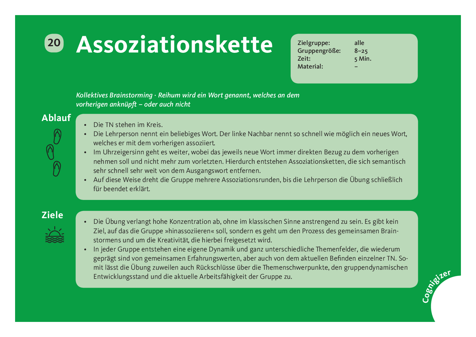 Diese Übung eröffnet viele Anwendungsgebiete und bewegt die TN zu kreativem Denken. Gleichzeitig lässt sie genügend Freiräume, sodass kein Zwang entsteht und ein humorvoller Beitrag in der Regel mit einem Schmunzeln belohnt wird: »Mir fällt nichts ein.«; »Na, da schließe ich mich doch einfach meinem Vorredner an«. Dies ermöglicht auch fachlich schwächeren (aber dafür vielleicht umso kreativeren) Teilnehmern einen Beitrag zu leisten, ohne sich zu dem Thema äußern oder darin besonders auskennen zu müssen. Wenn Sie diese Übung in wechselnden Kontexten einsetzen (Vorwissensabfrage, Kennenlernen, Reflexion), unterstützt sie das vernetzte Denken und vor allem das Sprechdenken Ihrer Teilnehmenden.