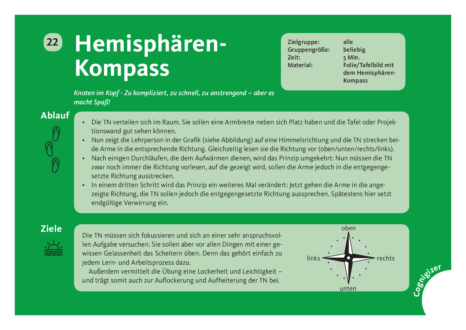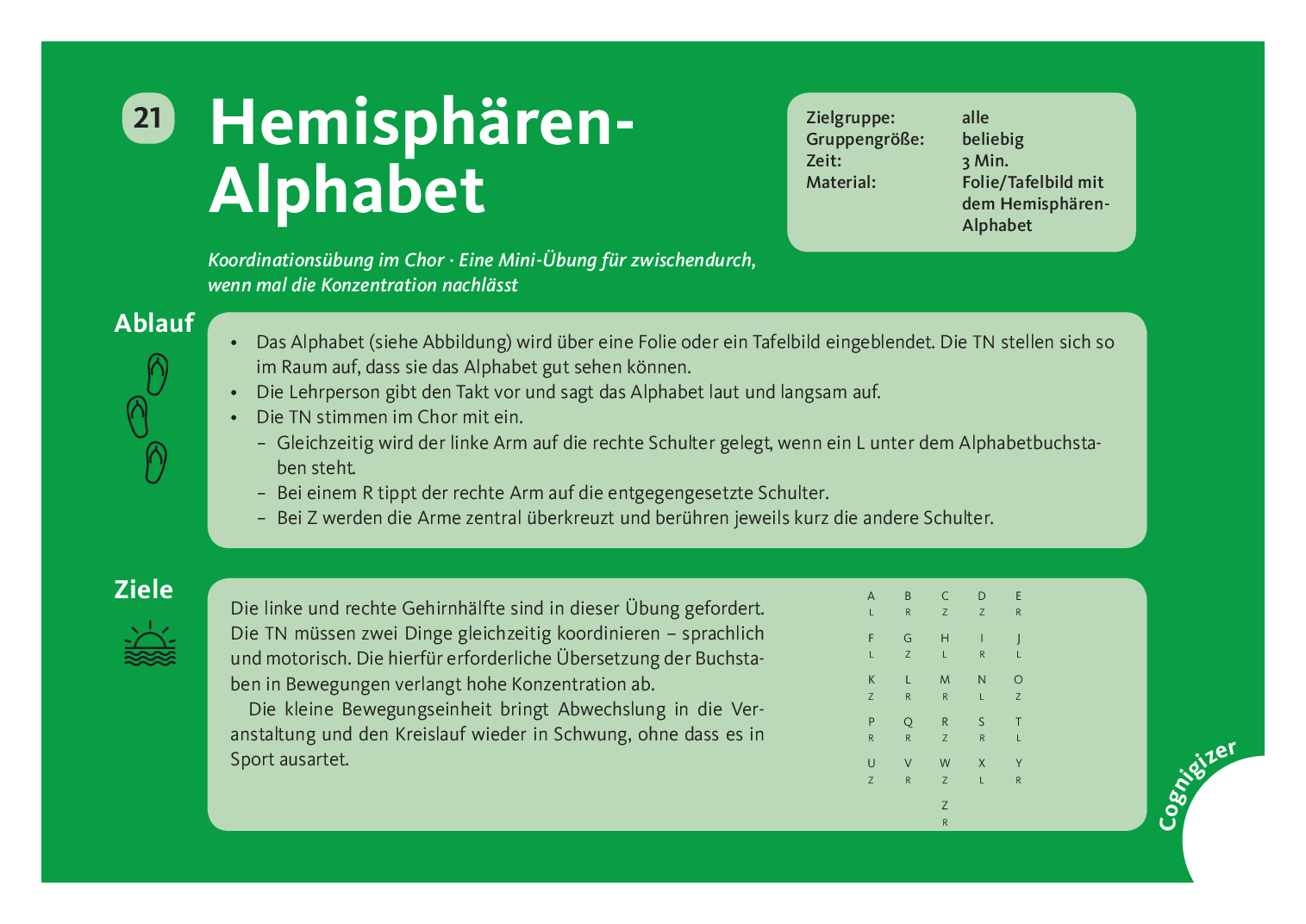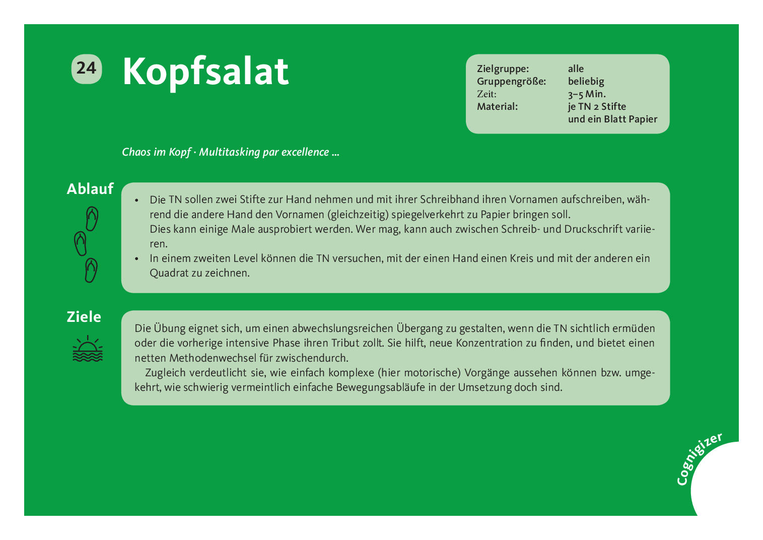 Ähnlich wie beim »Hemisphären-Alphabet« (Karte Nr. 21) geht es in erster Linie bei dieser Übung um die Koordination beider Gehirnhälften. Spätestens mit dem dritten Level setzt allerdings eine hohe Fehlerquote ein und die TN spüren, dass sie zu wenig Zeit für das (nochmalige) Umdenken haben. Insofern kann die Übung auch eingesetzt werden, um mit TN über Erfolge und Misserfolge im Lernprozess zu diskutieren, um die individuelle Frustrationstoleranz und Resilienz zu überprüfen, den Umgang mit Herausforderungen und Rückschlägen zu reflektieren oder das eigene Selbstmanagement zu beäugen (Wo überfordere ich mich manchmal, wo bin ich zu schnell unterwegs, was brauche ich, um auch komplexe Aufgaben systematisch zu meistern?). Weiter kann diese Übung bei neuen oder jungen Gruppen helfen, frühzeitig und vorschnell etablierte Hierarchie-Ebenen aufzubrechen, wenn zum Beispiel die eher schüchterne Person bei dieser Übung plötzlich punktet und die vorlaute Person es gnadenlos vergeigt. Dies kann die Stimmung entspannen und starke Hierarchiewahrnehmungen relativieren.