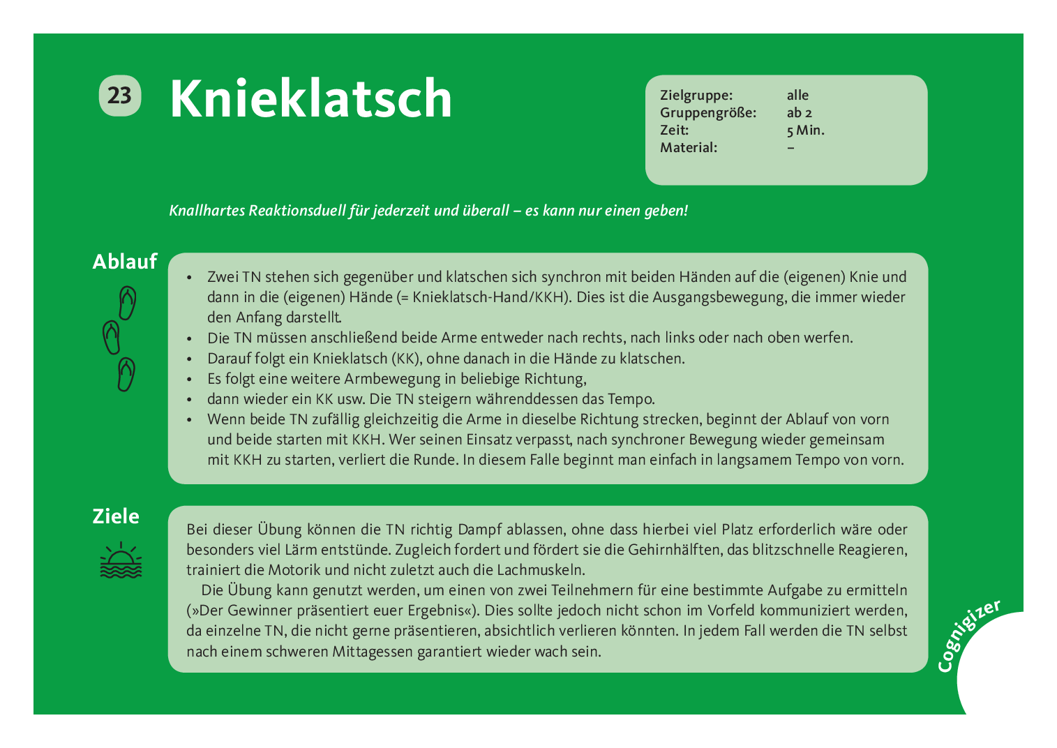 Diese Übung eignet sich besonders gut in Seminar und Schule, wenn das Wetter draußen zu schlecht ist oder die TN es einfach so versäumen, ihren Kreislauf in den Pausen ein wenig in Schwung zu bringen. Sie können hierbei auch gut beobachten, wie die TN ihre Reaktionsgeschwindigkeit sukzessive verbessern. Manche schaffen es in kurzer Zeit zu wahren Meistern und können sich dadurch auf eine ungebräuchlich unfachliche Weise als sehr selbstwirksam erleben. Reflektieren Sie nach dieser Übung doch einmal, wie die TN den Stresslevel erlebt haben, wie er sich im Laufe der Zeit verändert hat und wie die individuellen Strategien waren, mit den Herausforderungen dieser Übung umzugehen.