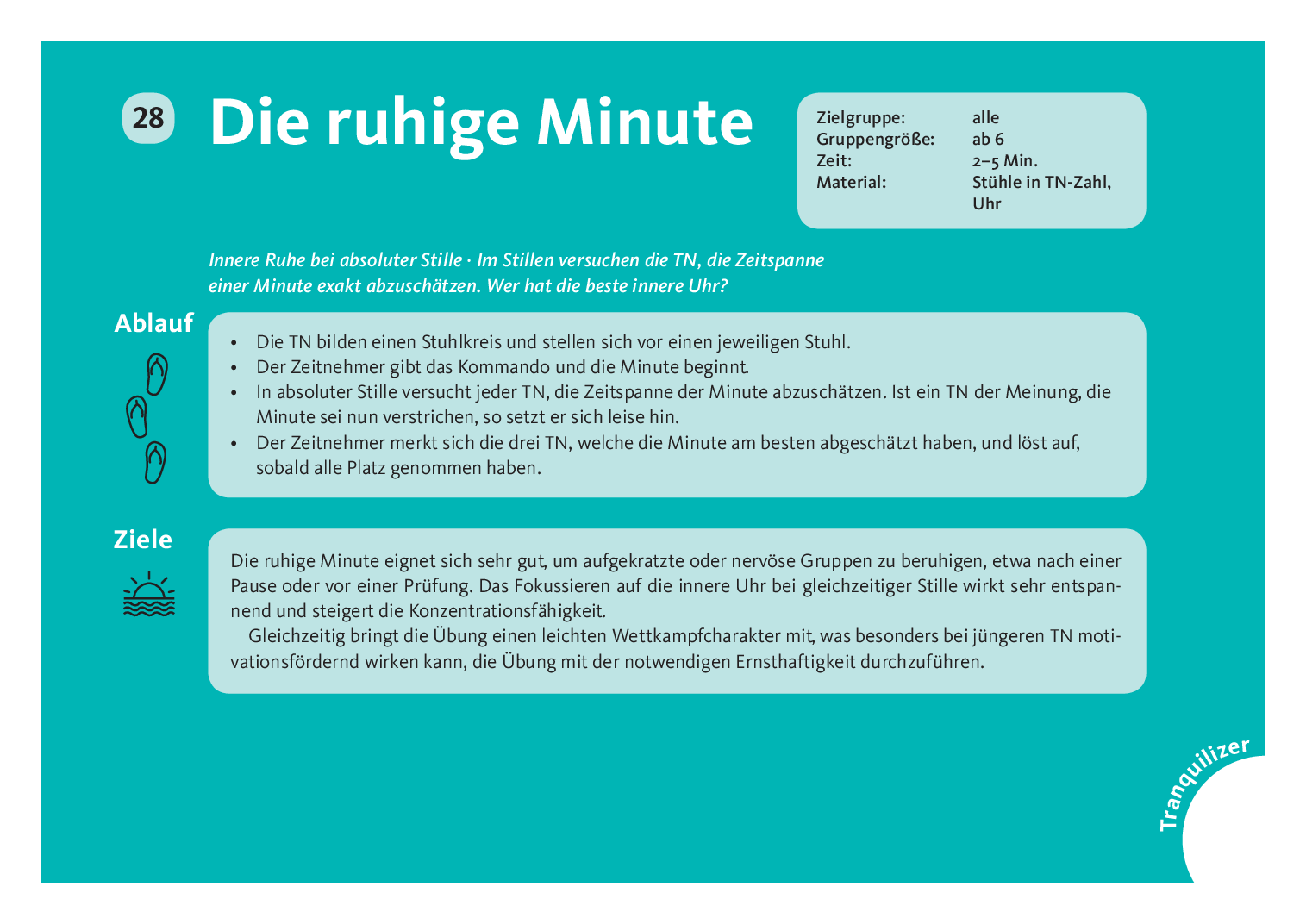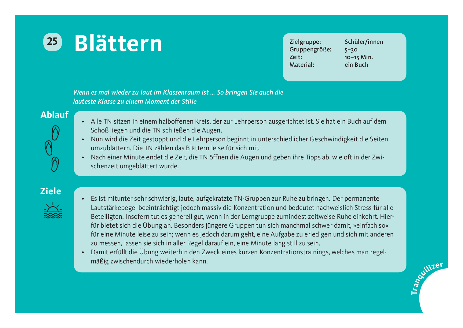 Tranquilizer unterstützen die Regulation. Hier finden Sie Übungen, die dazu beitragen können, die Lautstärke in einer Gruppe zu reduzieren.