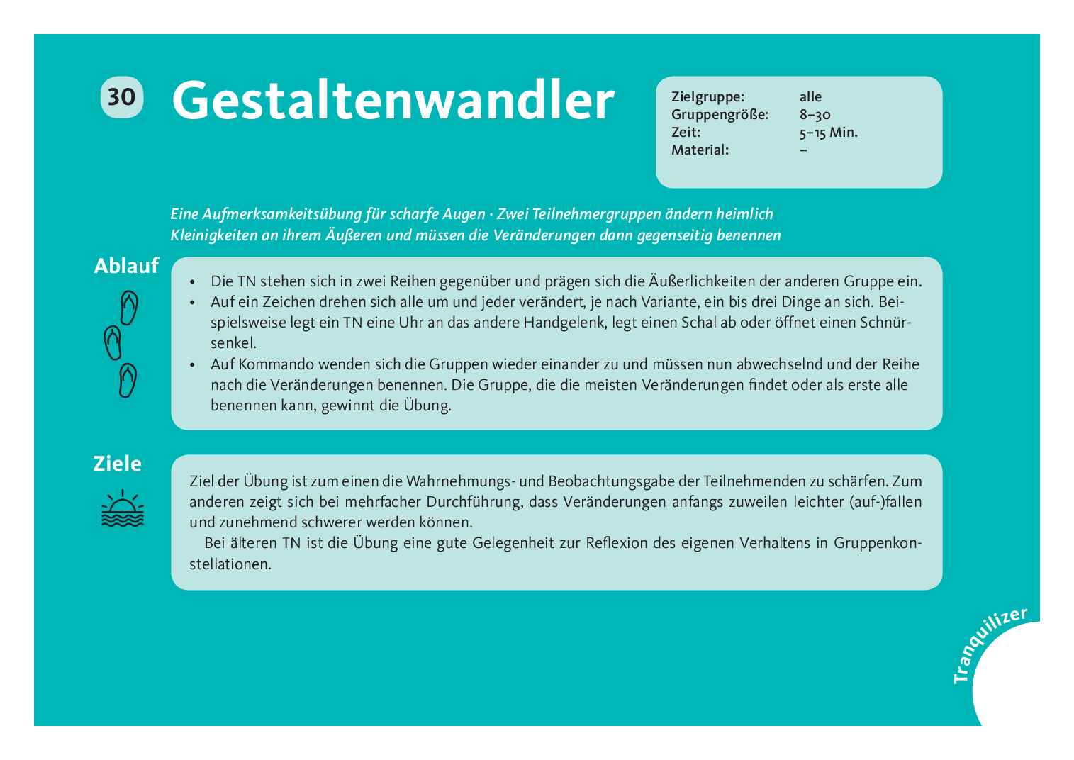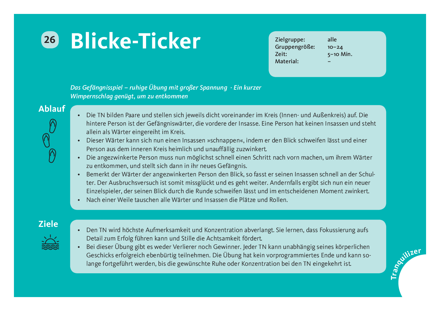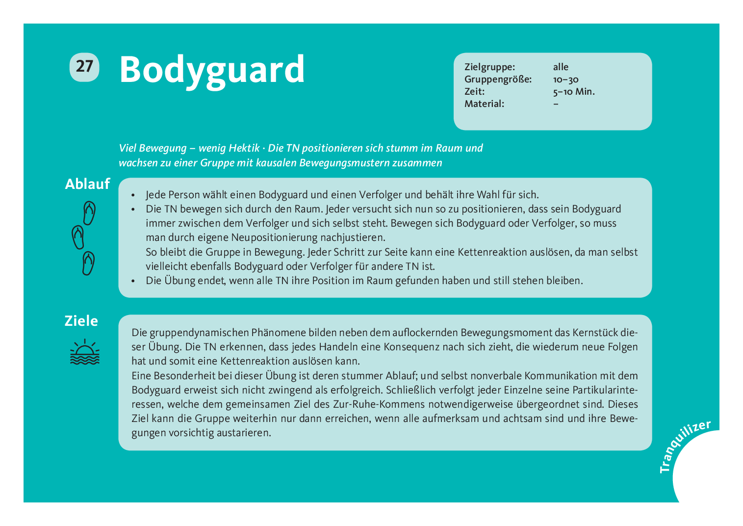 Tranquilizer bieten sich an, wenn eine Gruppe überaktiviert und unruhig ist. Viele dieser Übungen müssen nonverbal, manche auch mit geschlossenen Augen ausgeführt werden. Hierdurch werden einzelne Sinne zeitweise ausgeschaltet, um die Anzahl der Umgebungsreize zu reduzieren und einzelne Sinneswahrnehmungen zu schärfen. Der Lautstärkepegel in der Gruppe wird deutlich heruntergefahren, was eine Entlastung nicht nur für das Gehör, sondern auch für den individuellen Stresslevel bedeutet.
