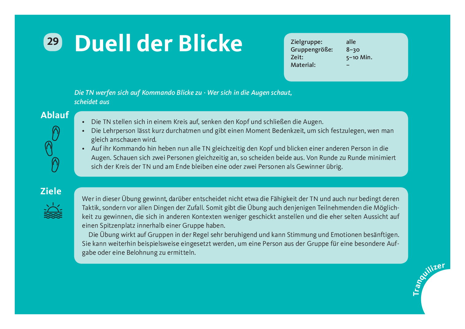 Die TN werfen sich auf Kommando Blicke zu. Wer sich in die Augen schaut, scheidet aus.