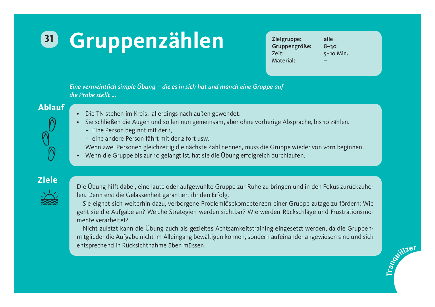 Die Übung kann dafür genutzt werden, um Ruhe einkehren zu lassen. Außerdem hält diese leicht erklärbare Übung wenig Potenzial für unterschiedliche Regelinterpretationen bereit, sodass sie praktisch mit jeder Zielgruppe (auch schon im elementarpädagogischen Bereich) durchgeführt werden kann. Sie können sie auch einsetzen, um einzelne Personen für bestimmte Zwecke zu ermitteln (Welche Schülerin darf das erste Adventskästchen öffnen? Welcher Seminarteilnehmer »darf« neuen Kaffee kochen?). Die Auswahl Einzelner kann auch im Rahmen von Gruppenarbeit erfolgen, wenn zum Beispiel innerhalb von Dreier- oder Fünfergruppen entschieden werden soll, wer das Gruppenergebnis im Plenum/vor der Klasse präsentieren soll.