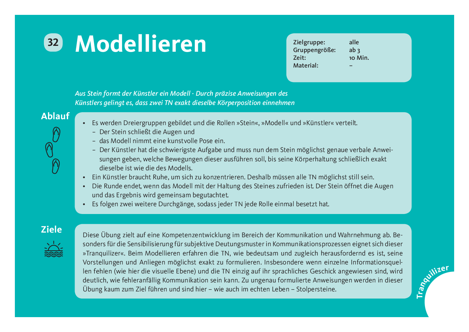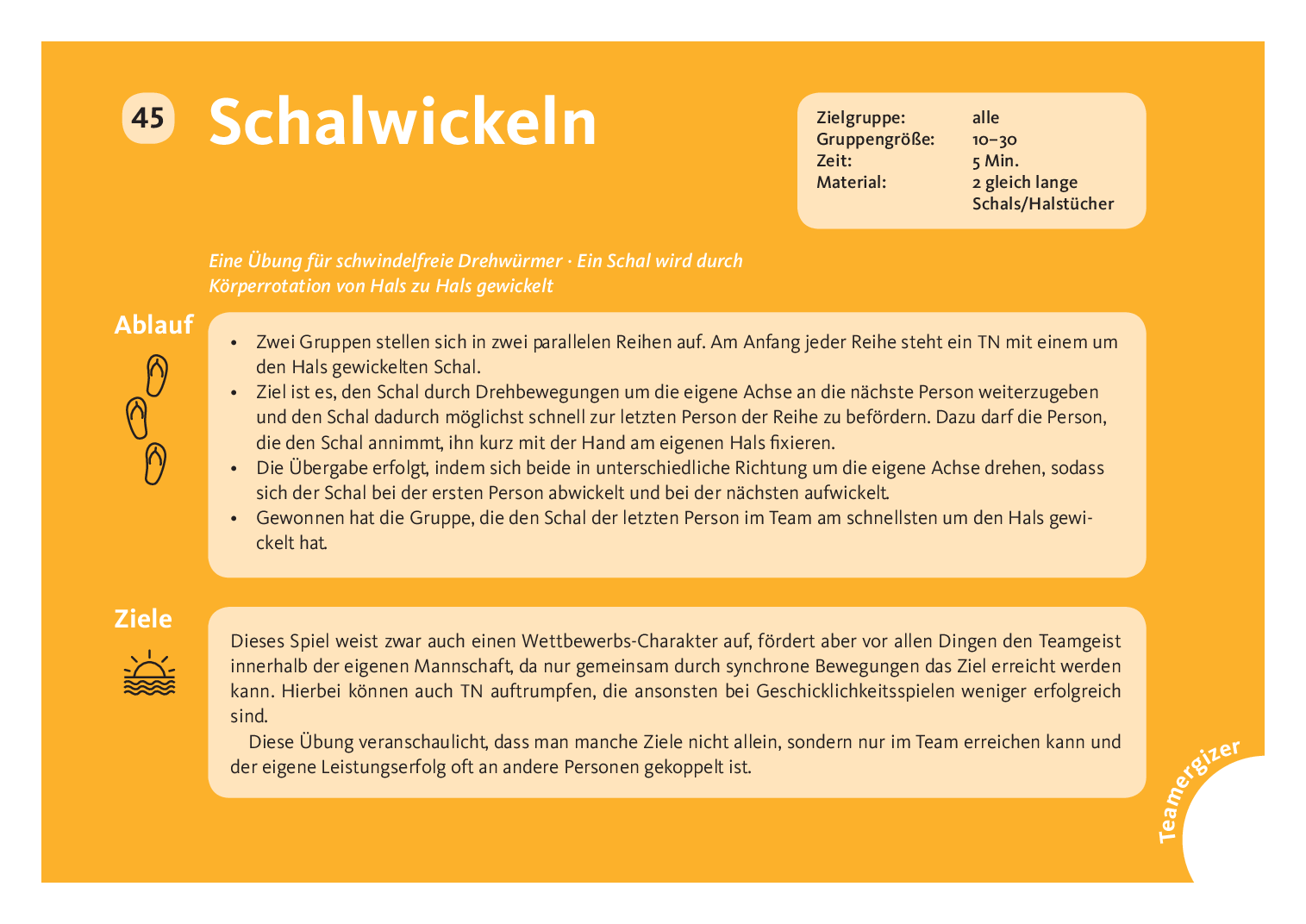 Auch bei dieser Übung kann das Ziel nur durch Partizipation aller Gruppenmitglieder erreicht werden. Allerdings können beim Schalwickeln auch TN mithalten, die ansonsten über weniger motorisches Talent verfügen. Genau dies kann eine interessante Reflexionsebene im Anschluss an die Übung sein: Wie habt ihr das Ziel erreicht? Wer war daran beteiligt? Was waren eure Erfolgsfaktoren und welche Strategien habt ihr genutzt? Wie lief die Kommunikation innerhalb eures Teams ab? Wichtig für ein zügiges Ab- und Aufwickeln des Schals ist nicht so sehr ein hohes, sondern vielmehr ein gemeinsames Tempo. Wenn sich »Schalsender« und »Schalempfänger« gut aufeinander einlassen und sich in ihrem Tempo synchronisieren, werden sie viel besser ans Ziel gelangen. Somit lässt sich die Übung auch als Metapher für generelle Kommunikationsprozesse oder zur Einführung von Kommunikationsmodellen nutzen.