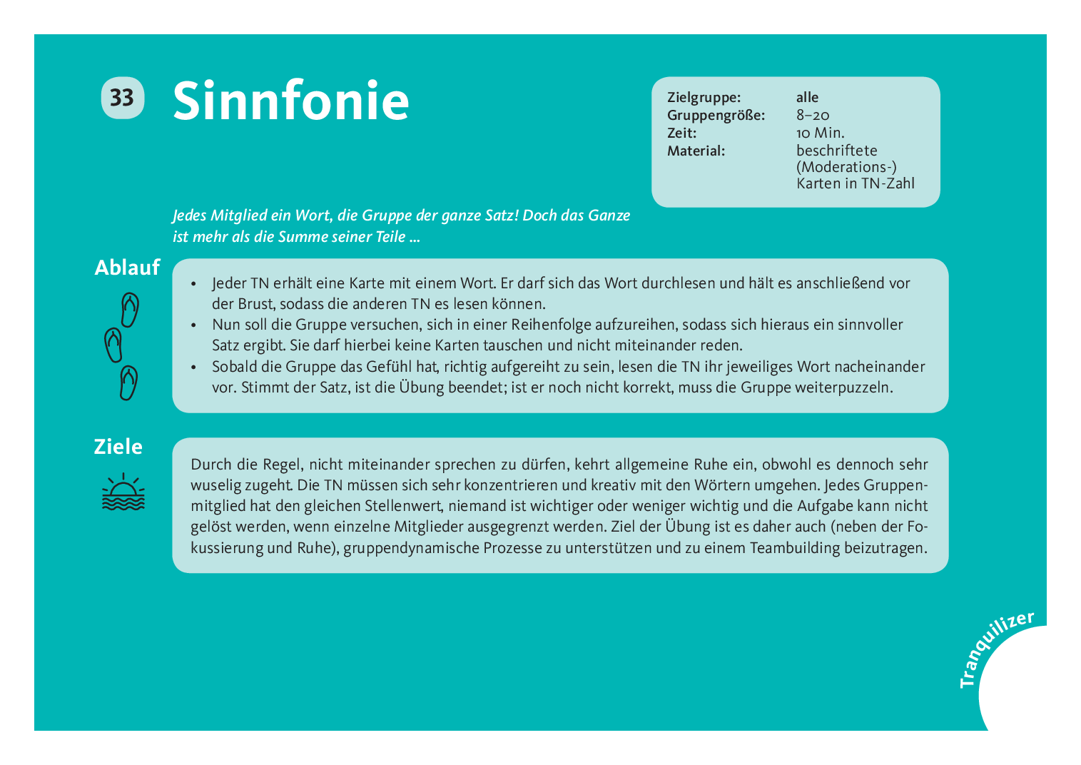 Ob Klassenzimmer oder Seminarraum - diese Übungen bringen neuen Schwung in Lernsituationen und helfen, die Aufmerksamkeit der Teilnehmenden zurückzugewinnen. Dazu brauchen Sie nicht mehr als eine der Karten aus dem Set und ein paar Minuten Zeit.