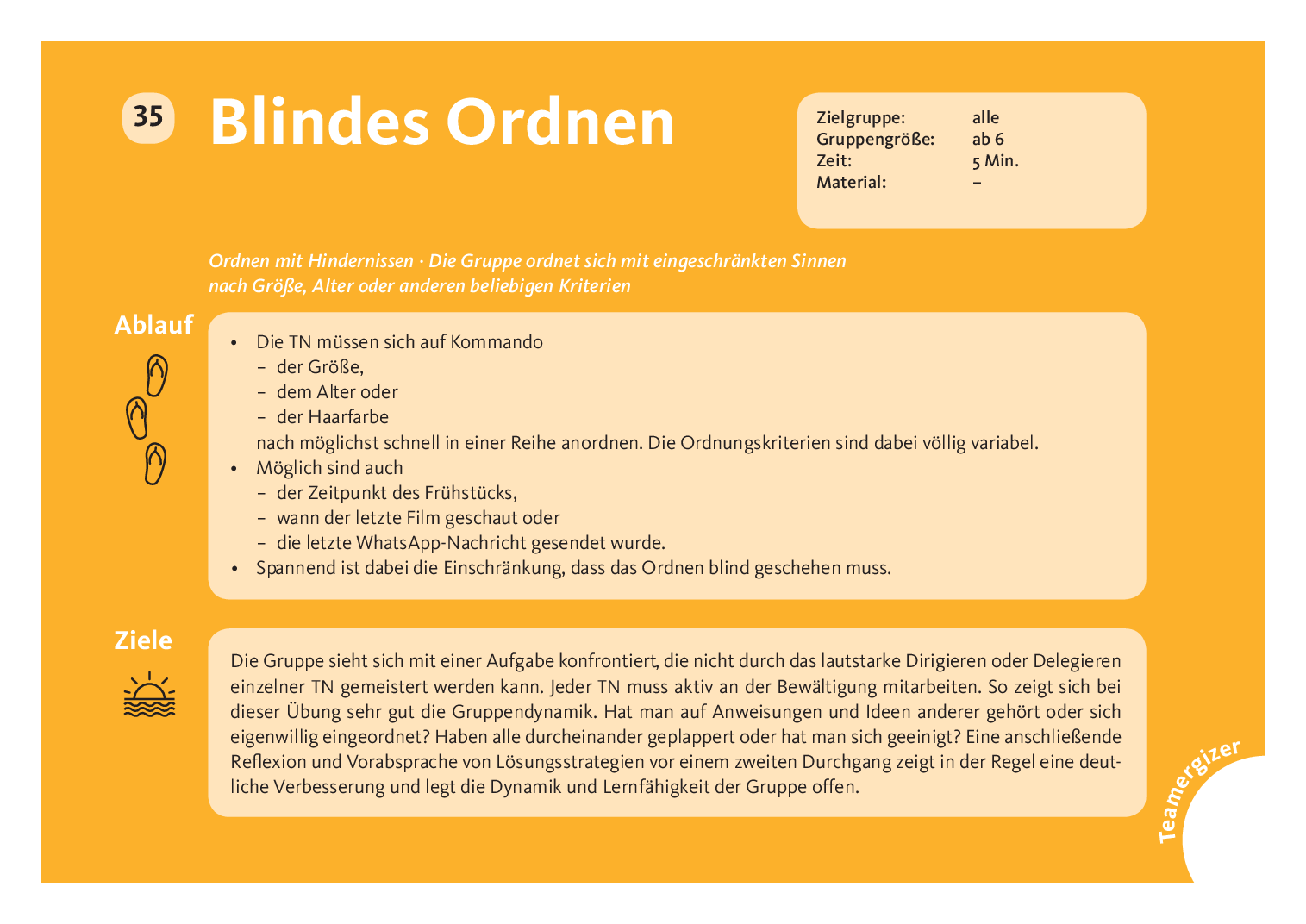 Diese Übung eignet sich sehr gut, um mehr über die Dynamik und Lernfähigkeit einer Gruppe zu erfahren. Aber auch über den Umgang mit Stress-Situationen (wenn das Ordnen unter Zeitdruck geschieht) und die Frustrationstoleranz der Gruppe oder einzelner TN gibt die Übung Aufschluss. Weiter kann dieser Teamergizer als Einstieg genutzt werden, um die Kommunikationskultur der Gruppe zu reflektieren: Wie haben sich die TN geeinigt? Inwieweit haben sich einzelne TN an den richtigen Platz gestellt und dann aus dem Geschehen herausgehalten, konstruktive Vorschläge gemacht oder mit unnötigen Bemerkungen den Prozess verlangsamt?