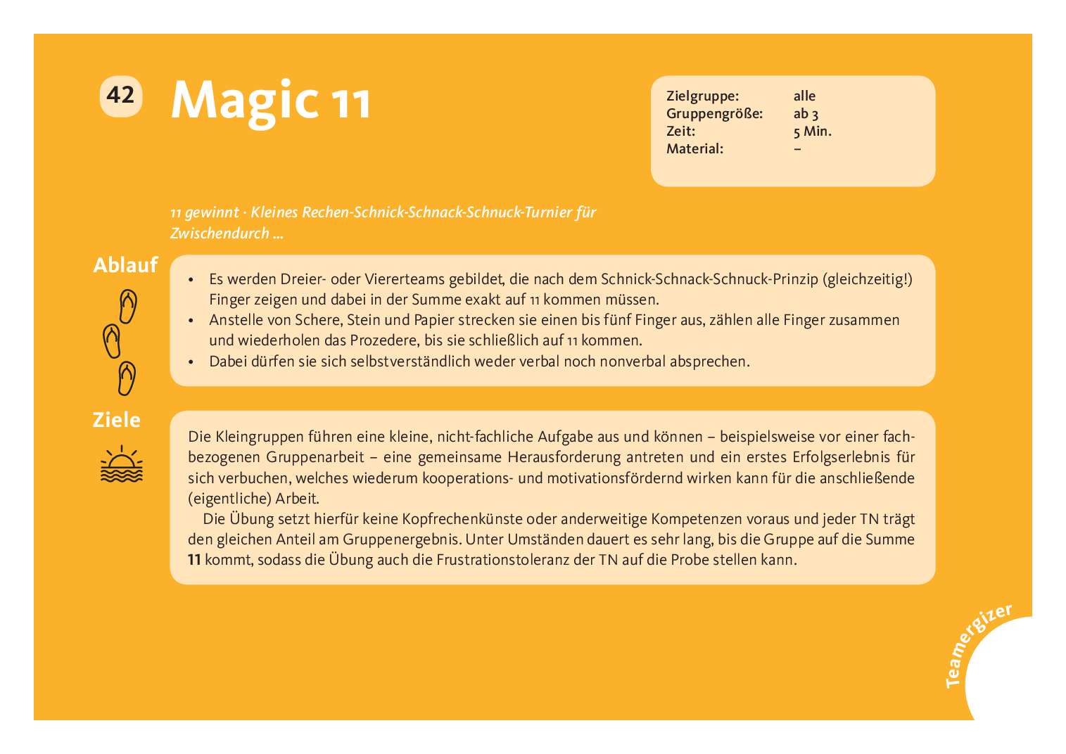 Die Übung bietet Gelegenheit, darüber zu reflektieren, dass in Teams vieles dem Zufall überlassen bleibt und dass es darum geht zu lernen, hiermit umgehen zu können. In dieser Übung ist es irgendwann »zufällig« die richtige Anzahl an Fingern zu zeigen, im übertragenen Sinne kann man sich oftmals seine Teammitglieder nicht aussuchen, findet sich darin eher »zufällig« mal als Experte, mal als Laie im Vergleich zu den Kompetenzen der anderen wieder oder muss sich mit Rahmenbedingungen arrangieren, die ebenfalls teils dem Zufall zu verdanken sind. Auf der anderen Seite lässt sich anhand dieser Übung verdeutlichen, dass Strategien nur dann wirklich wirksam sind, wenn man sie miteinander austauschen und sich abstimmen kann. Lassen Sie doch einmal, auch wenn es augenscheinlich trivial ist, die TN im Vorfeld eine gemeinsame Strategie absprechen, bevor es losgeht. Normalerweise sollten nun alle Gruppen genau einen Versuch benötigen, um auf 11 zu kommen. Dies kann auf simpelste Weise verdeutlichen, wie unglaublich viel effektiver ein Team ein Ziel erreichen kann, wenn es sich im Vorfeld abstimmt und einigt, und dass es vor allem sehr viel weniger müßig, frustrierend und zeitaufwändig sein wird, wenn man sich zuvor die Zeit genommen hat, um miteinander das Vorgehen zu besprechen.