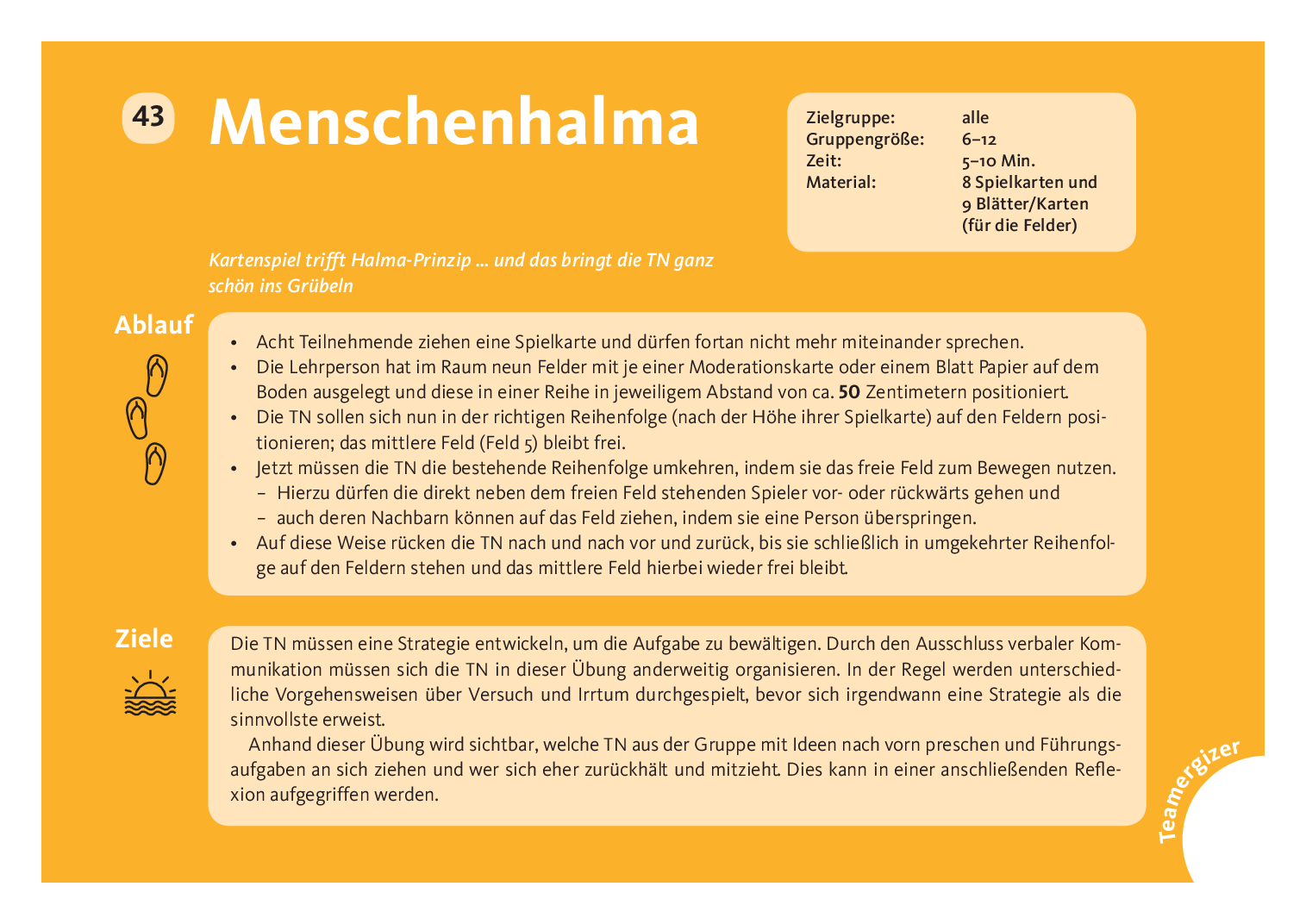 Beim Menschenhalma lassen sich die Aspekte des Führens und Folgens in Gruppen gut beobachten und reflektieren: Wer entwickelt als Erstes eine Idee, wie die Übung gemeistert werden kann? Wer versucht seine Strategie durchzusetzen und mit welchen Mitteln? Wann wird eine Strategie verworfen, wenn sie sich als wenig nützlich erwiesen hat? Wie haben sich die TN gefühlt, die hin- und hergeschoben, zur Seite geschickt und in ihre Schranken verwiesen wurden? Inwieweit hat die Gruppe als Ganzes mitgewirkt oder einzelnen Teilnehmenden das Gestaltungsfeld überlassen? Wenn den Teilnehmenden das Sprechen untersagt wird, handelt es sich folglich um eine (zumindest akustisch) ruhige Übung. Wenn Sie zwei Gruppen gegeneinander antreten lassen, ihnen das Sprechen erlauben, jeweils einen Schiedsrichter installieren und dann schauen, welches Team schneller seine Reihenfolge regelkonform umgekehrt hat, dann können Sie von einem entsprechend umso höheren Lautstärkepegel ausgehen.