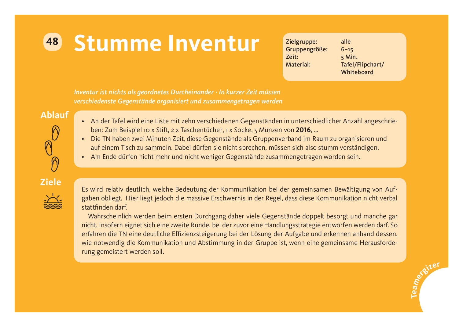 Durch die Regel, während der Übung nicht miteinander sprechen zu dürfen, werden die TN in ihrer Kommunikation spürbar eingeschränkt. Vereinbarungen mit Hand, Fuß und Stift, wer was und wie viel Stück wovon besorgen kann oder soll, werden im ersten Durchlauf eher selten erfolgreich gelingen. Zwangsläufig wird Arbeit doppelt geschehen oder gar nicht erledigt. Im zweiten Durchgang, welcher nach einer Strategiebesprechung erfolgt, erleben sich die TN in der Regel als deutlich wirksamer. Und dennoch können sie auch diese Absprache und Strategie wiederum kritisch reflektieren und weitere Verbesserungsvorschläge entwickeln. So nähern sie sich schrittweise einer möglichst effektiven Kommunikationskultur und der bestmöglichen Lösungsstrategie an.