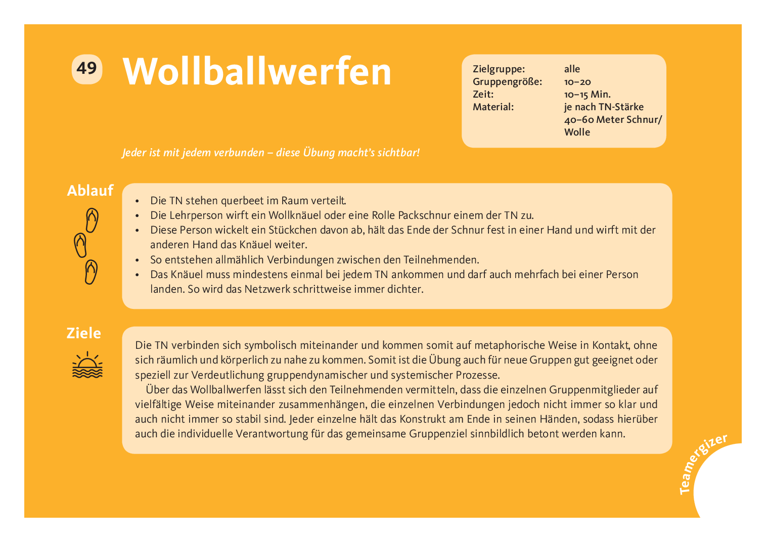 Diese Übung ist prädestiniert für intensive Austauschrunden. Das Wollballwerfen kann Spaß machen, kann aber auch etwas langatmig werden, sodass es gar nicht primär um die Durchführung gehen sollte, sondern vielmehr um den Erkenntniswert, welcher durch das entstehende Netz generiert werden kann. Sie können mithilfe der Übung über die neuronalen und synaptischen Verbindungen in unserem Gehirn aufklären, über unsere virtuellen und realen Kontakte in den sozialen Netzwerken philosophieren, die Kommunikationsachsen innerhalb größerer Gruppen verdeutlichen, die oftmals verborgenen Anknüpfungspunkte der je individuellen Erlebniswelten der Teilnehmenden andeuten, die Komplexität systemischer Verbindungen und Abhängigkeiten in institutionellen oder auch in familiären Kontexten diskutieren etc.