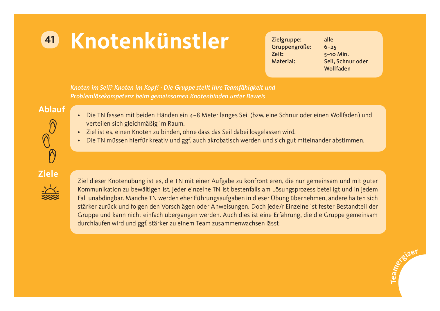 Einen Knoten zu binden, zählt zu den eher kleineren Herausforderungen in unserem Alltag. Diese Übung demonstriert, dass auch scheinbar einfache Aufgaben in der Gruppe oder im Team manchmal deutliche Schwierigkeiten mit sich bringen und alternative Lösungsstrategien erfordern. Hier lässt sich eine starke Parallele zu Problemen in der Gruppen- oder Teamarbeit erkennen: Das Team verzweifelt an scheinbar leichten Aufgaben. Weiter wird hierbei deutlich, dass Kommunikation oft eine zentrale Rolle bei der Bewältigung neuer Aufgaben spielt. Schaffen es die TN bei dieser Übung nicht, eine gemeinsame Strategie zu entwickeln, so wird das Knotenbinden nahezu unmöglich.