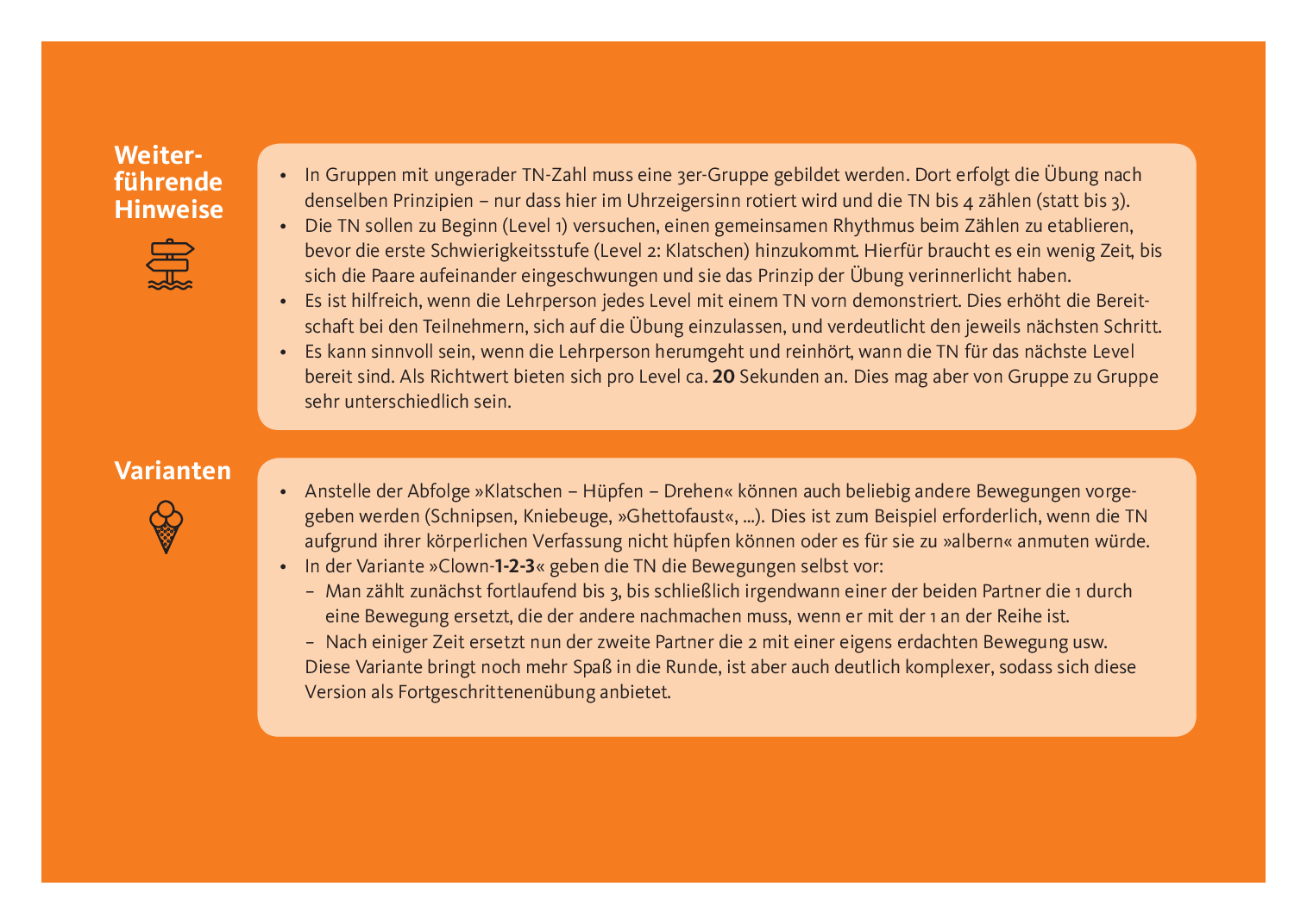 Da Übungen, in denen Multitasking-Aufgaben abverlangt werden, immer auch ein gewisses Frustrationspotenzial in sich bergen, sollte hier in gemäßigtem Tempo begonnen werden. Außerdem ist es gegebenenfalls ratsam, den TN zu verdeutlichen, dass es nicht um ein fehlerfreies Durchführen der Bewegungen geht, sondern vielmehr um die Fokussierung auf die Aufgabe. Fehler sind hier also sehr unproblematisch und liegen in der Natur der Übung – insbesondere dann, wenn man das Tempo anzieht. Die Übung kann in einer anschließenden Reflexion als Metapher genutzt werden, um mit den TN darüber zu sinnieren, worauf es ankommt, wenn man mehrere Aufgaben gleichzeitig miteinander kombinieren muss, die zunächst nichts miteinander gemein haben. Dies gilt sowohl für Teamwork als auch für eigenständiges Lernen oder Arbeiten.