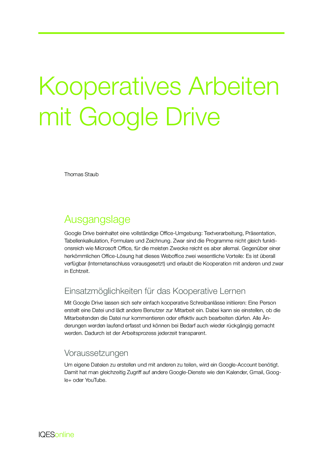 Mit Google Drive lassen sich sehr einfach kooperative Schreibanlässe initiieren: Eine Person erstellt eine Datei und lädt andere Benutzer zur Mitarbeit ein. Alle Änderungen werden laufend erfasst und können bei Bedarf auch wieder rückgängig gemacht werden. Dadurch ist der Arbeitsprozess jederzeit transparent. Die folgende Datei fasst die Einsatzmöglichkeiten von Google Drive zusammen und erhält Tipps, wie man die Plattform in den Unterricht einbauen kann.