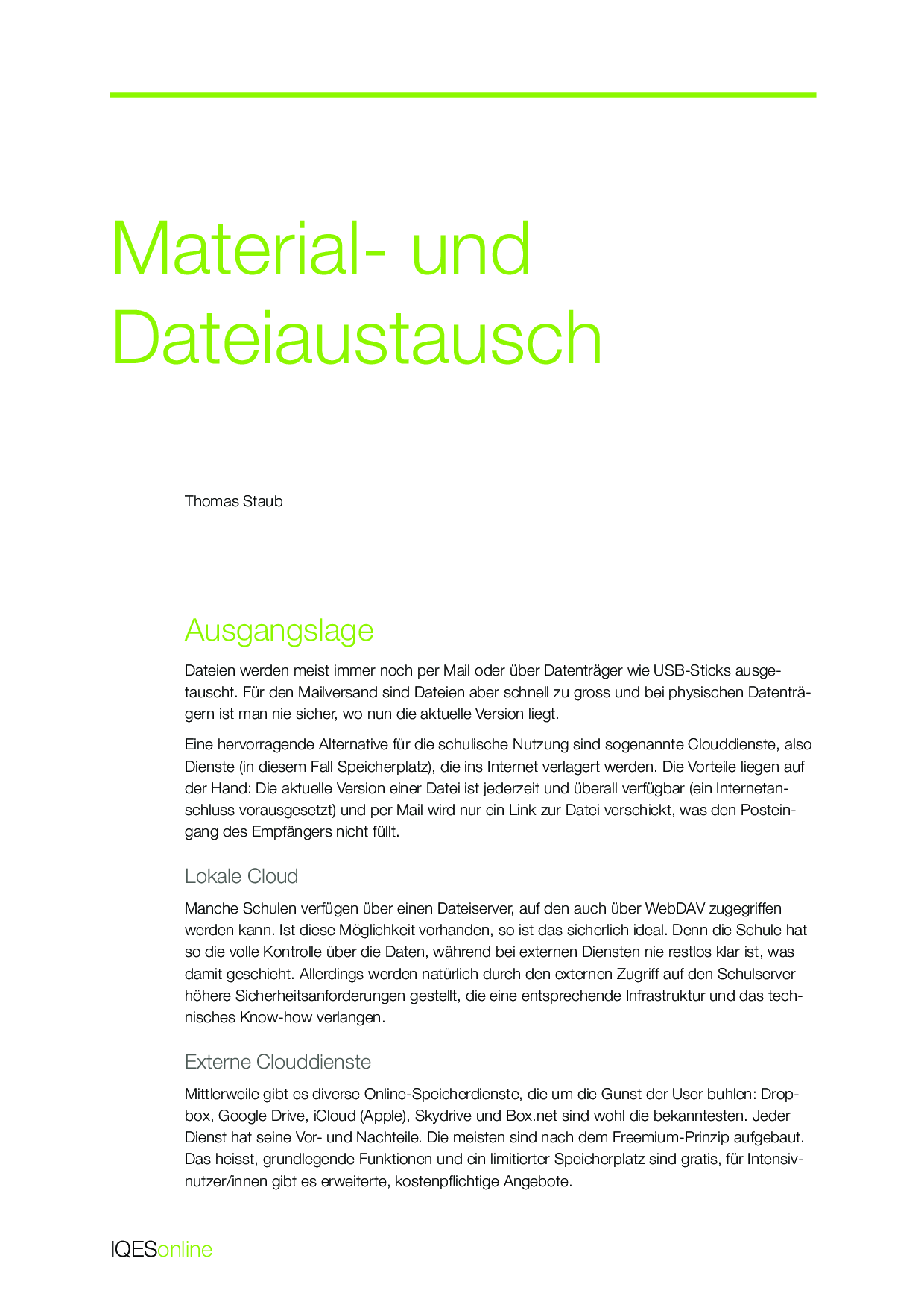 Dateien werden meist immer noch per Mail oder über Datenträger wie USB-Sticks ausgetauscht. Eine hervorragende Alternative für die schulische Nutzung sind sogenannte Clouddienste, also Dienste (in diesem Fall Speicherplatz), die ins Internet verlagert werden. In diesem Text werden verschiedene Anbieter miteinander verglichen.