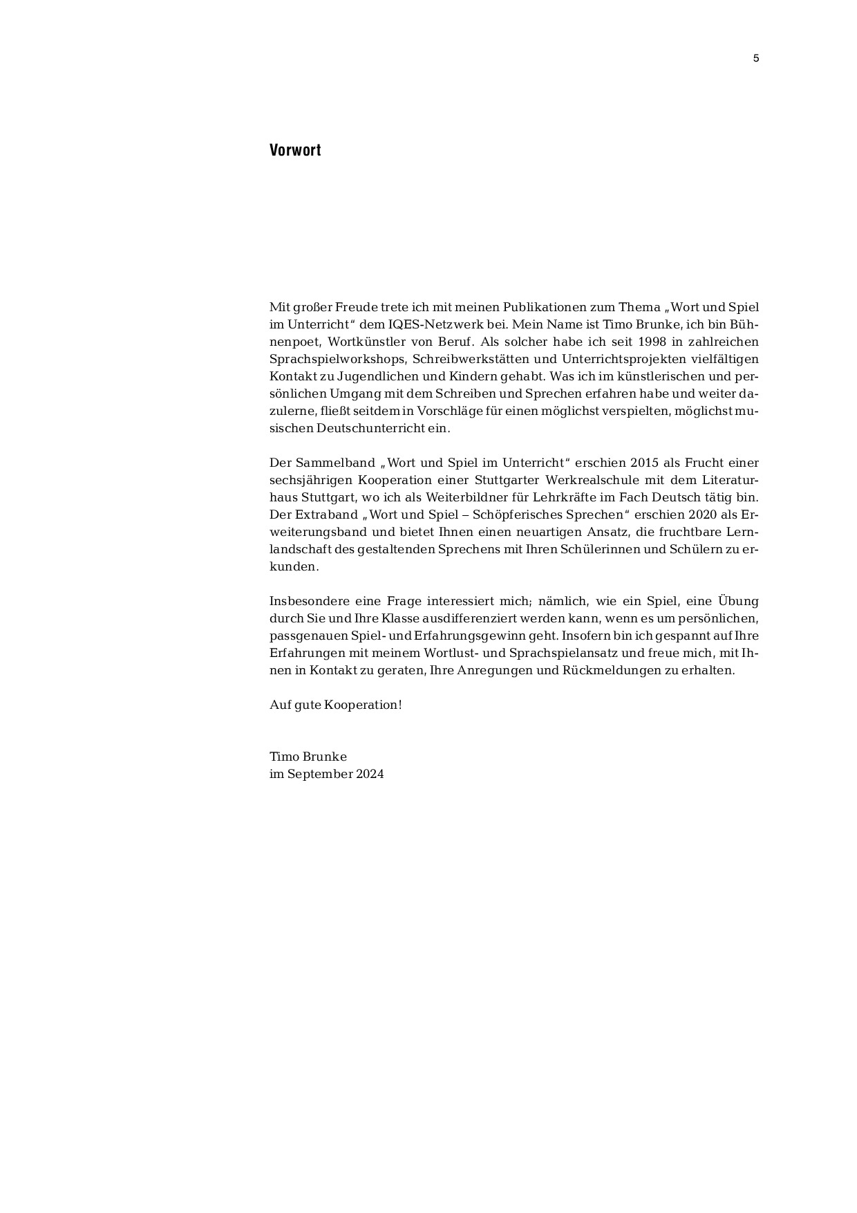 Die Sprachspiele setzen nicht bei grammatischen Regeln oder literarischen Analysen an, sondern bei der sinnlichen Erfahrung von Sprache. Sie machen das Wort als physikalische, akustische und rhythmische Größe erfahrbar, noch bevor es um Bedeutungen geht. Timo Brunke schafft damit einen grundlegend anderen Zugang zum Sprachunterricht, der vor allem die ästhetische Dimension der Sprache in den Mittelpunkt stellt.