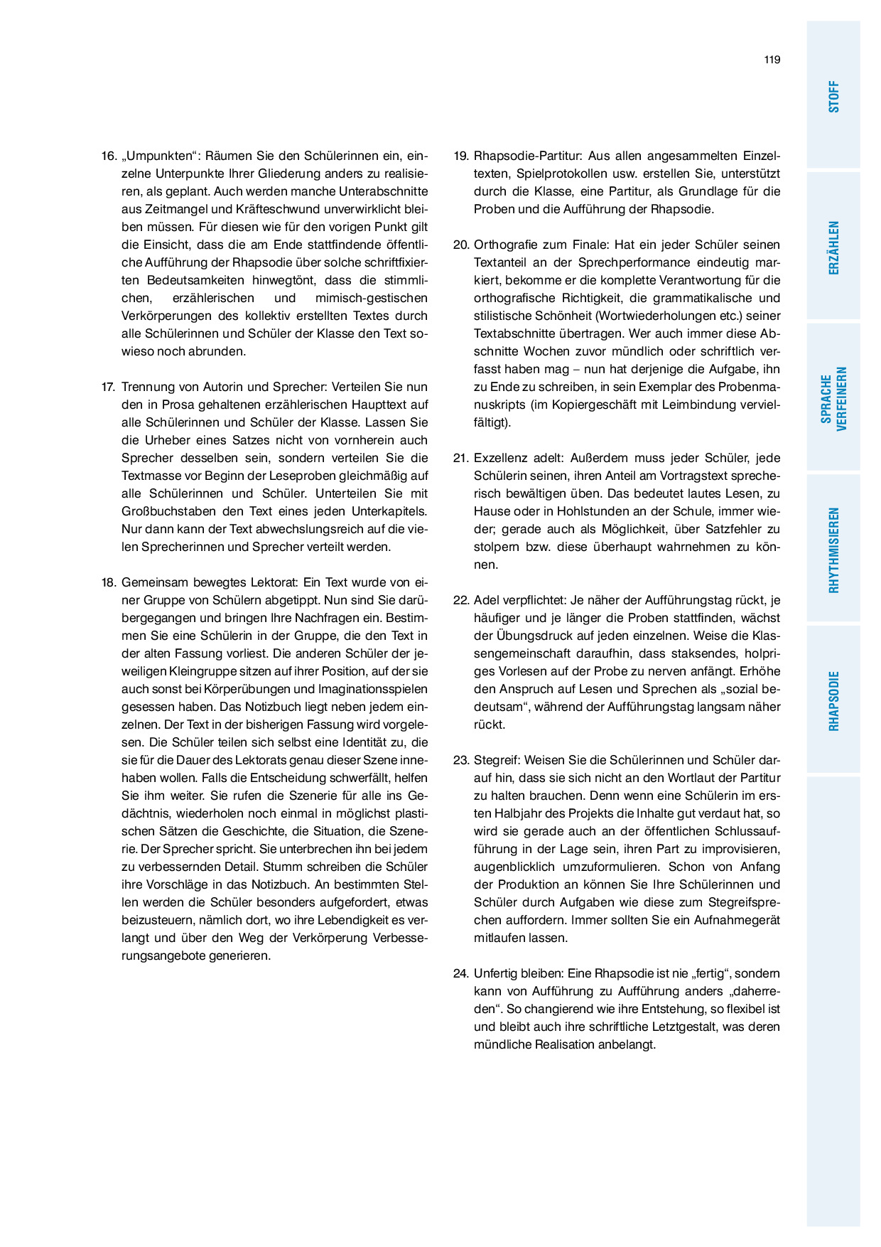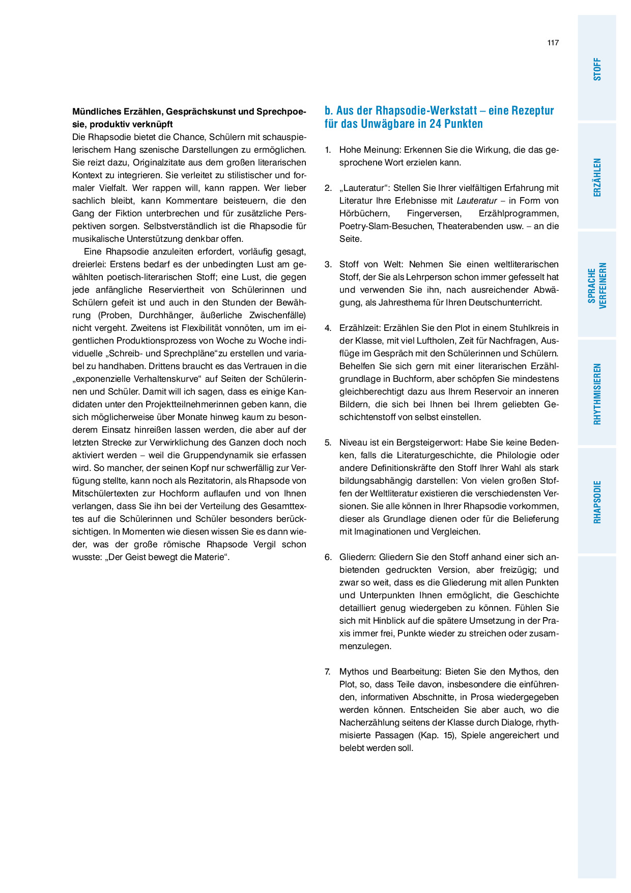 Die Methode überwindet die oft beklagte Kluft zwischen Textanalyse und Lesefreude. Sie nimmt die ursprüngliche Bedeutung der Rhapsodie als »Gesang der Verse« ernst und bringt die klangliche und performative Dimension von Literatur zurück in den Unterricht.