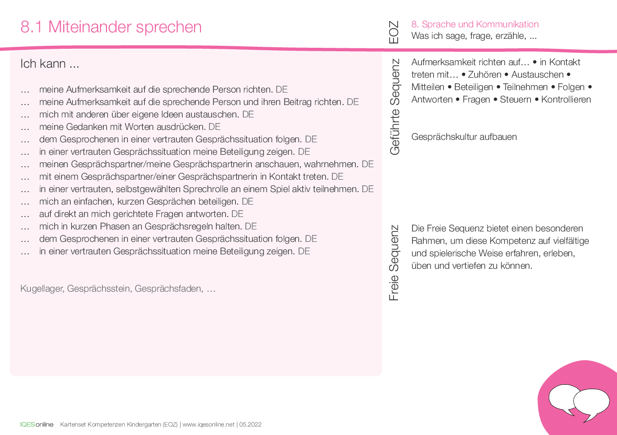 Die Kompetenzkarten sind Türöffner für verschiedene Gespräche, mit und ohne Eltern. Sie ermöglichen vielfältige Sprechanlässe und Möglichkeiten, sich auszutauschen, miteinander ins Gespräch zu kommen. Gleichzeitig üben die Lernenden, sich für andere verständlich und klar auszudrücken, sie entwickeln und erproben ihren Sprachschatz. Dabei werden Erfahrungen versprachlicht. Dadurch erst wird ein Gespräch über Bedeutung und Einschätzung der eigenen Erfahrungen erst möglich. In diesem Gespräch übernimmt die Lehrperson die wichtige Aufgabe zuzuhören und durch geeignete Fragen zu ermutigen. Empathie wiederum unterstützt das Kind auch bei der Einschätzung der eigenen Erfahrungen.