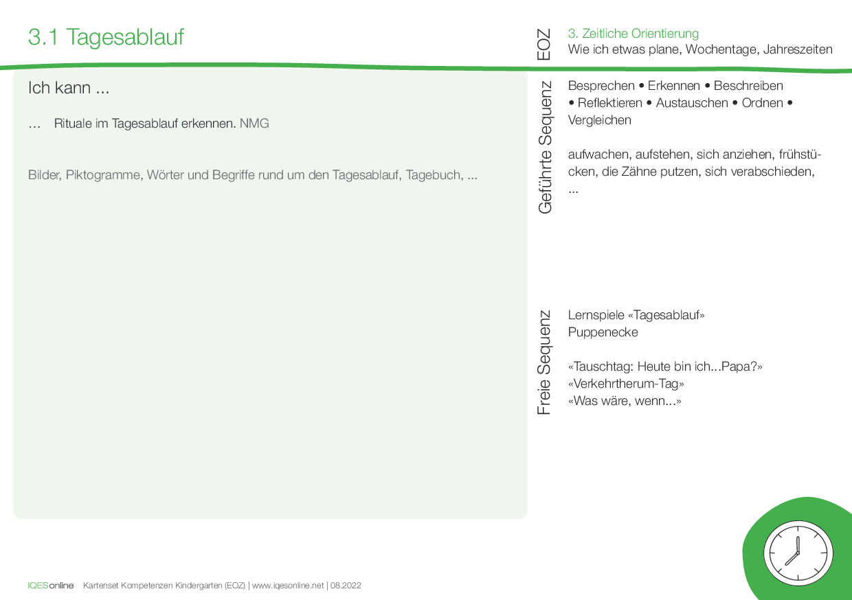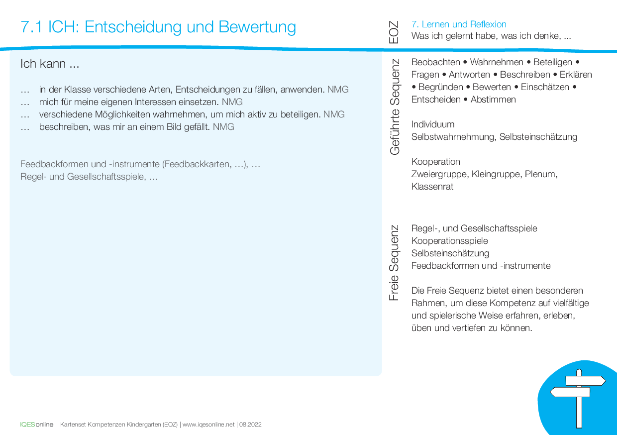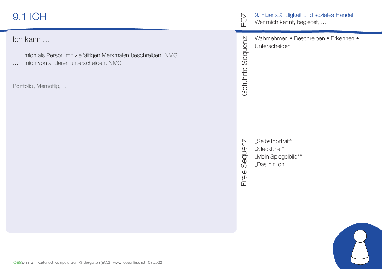 Diese Karte ergänzt das Kartenset um drei wichtige Aspekte für die Beobachtung, Einschätzung und Bewertung des individuellen Kompetenzstands sowie der individuellen Kompetenzentwicklung eines Kindes. Die Karte ermöglicht es der Lehrperson zudem, in Lern-, Entwicklungs- und Standortgesprächen diesbezüglich noch vertiefter und detaillierter zu dokumentieren.