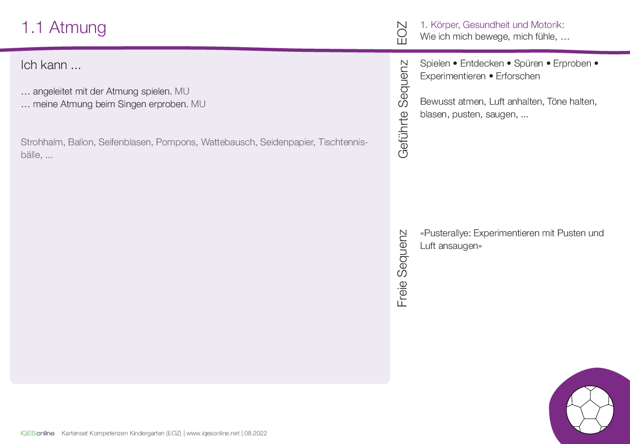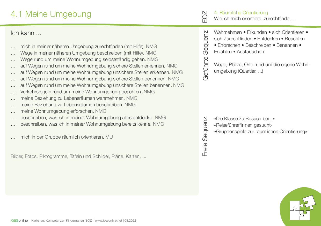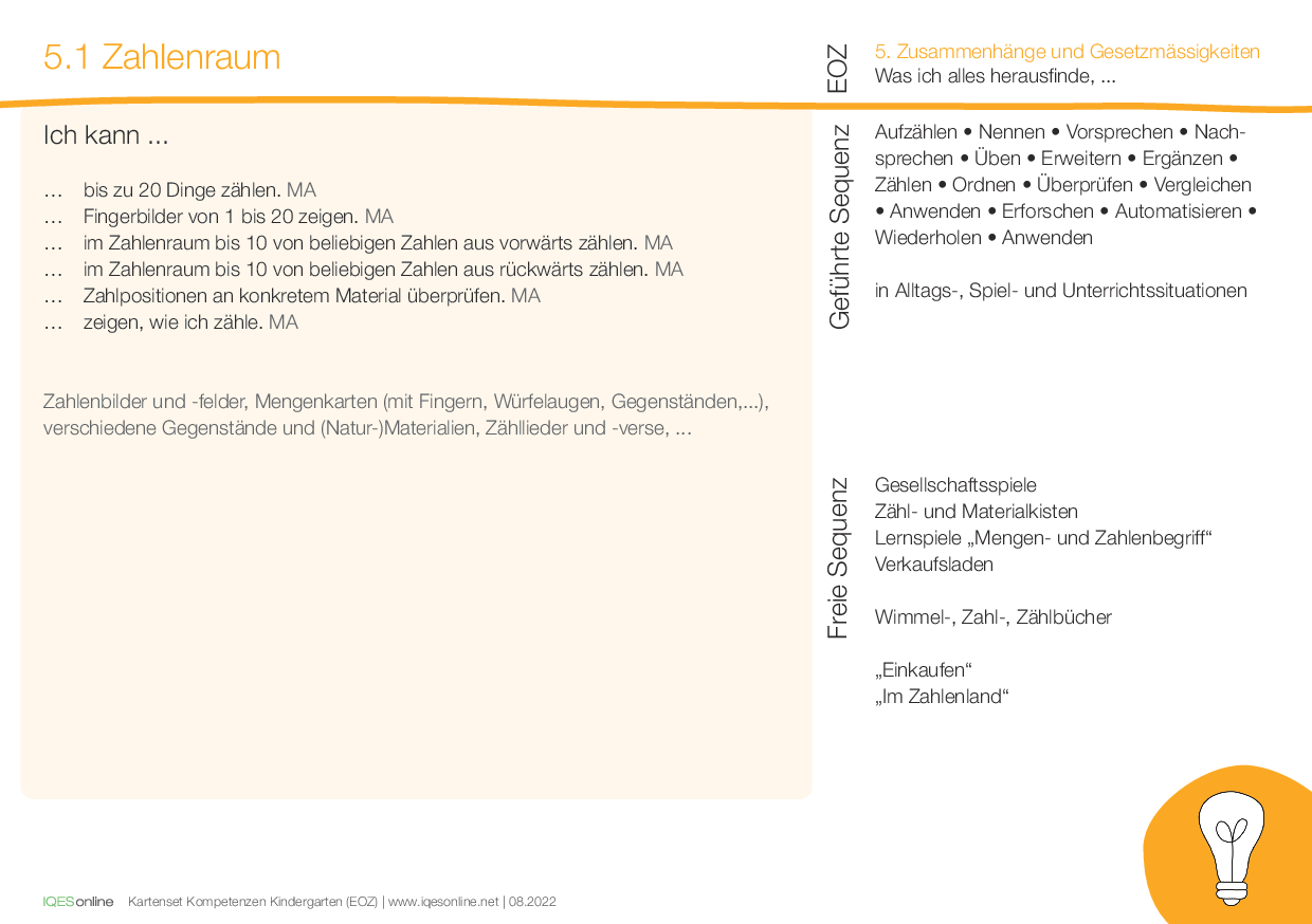Diese Karte ergänzt das Kartenset um drei wichtige Aspekte für die Beobachtung, Einschätzung und Bewertung des individuellen Kompetenzstands sowie der individuellen Kompetenzentwicklung eines Kindes. Die Karte ermöglicht es der Lehrperson zudem, in Lern-, Entwicklungs- und Standortgesprächen diesbezüglich noch vertiefter und detaillierter zu dokumentieren.