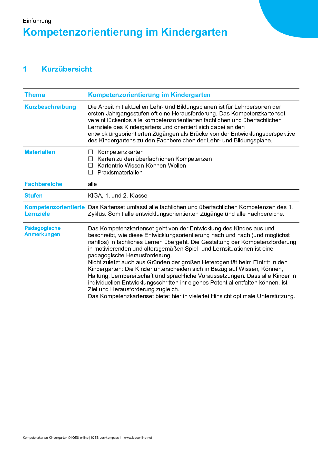 Das Dossier gibt eine kurze Übersicht über die Grundlagen der Kompetenzorientierung im Kindergarten, den Aufbau und die Inhalte des Kompetenzkartensets und dessen Einsatz in der Praxis, inklusive vielfältiger Materialien.