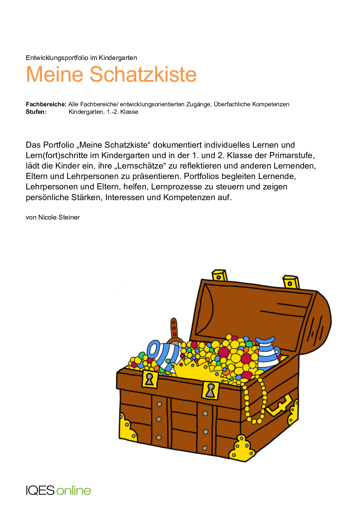 Das Lernentwicklungsportfolio »Meine Schatzkiste« sammelt und dokumentiert individuelles Lernen und Lern(fort)schritte im Kindergarten, sowie in der 1. und 2. Klasse der Primarstufe. Es lädt die Kinder ein, ihre »Perlen und Schätze« zu reflektieren und anderen Lernenden, Eltern und Lehrpersonen zu präsentieren. Die Schatzkiste begleitet Lernende, Lehrpersonen und Eltern, hilft, Lernprozesse zu steuern und zeigt persönliche Stärken, Interessen und Kompetenzen des Kindes auf.