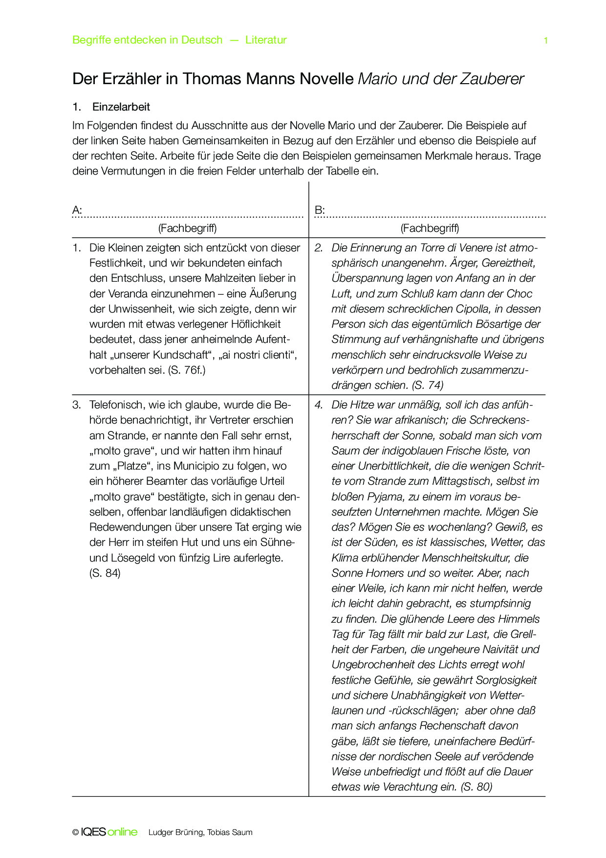 Anhand eines Ausschnitts der Novelle Mario und der Zauberer von Thomas Mann lernen die Schüler das Konzept des erlebenden und des erzählenden Ichs kennen. In zwei Spalten stehen ihnen die jeweiligen Erzählarten zur Verfügung, die sie dann identifizieren müssen.