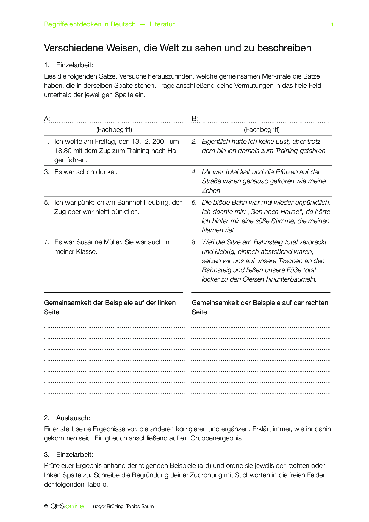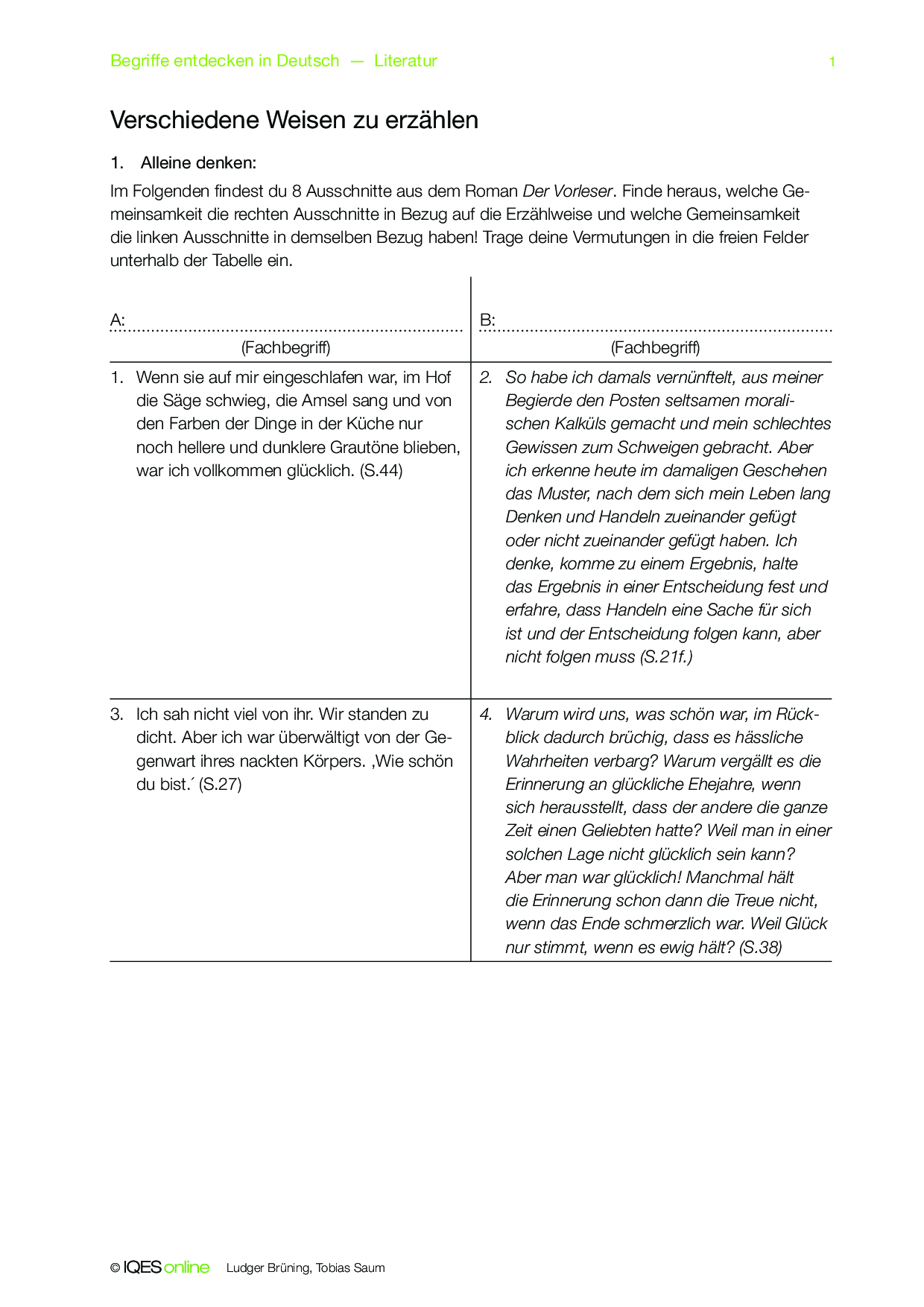 Mit diesem Concept Attainment lernen die Schülerinnen und Schüler zwischen dem erlebenden Ich und dem erzählendem bzw. reflektierendem Ich zu unterschieden. Dazu sind Textbeispiele aus dem Roman Der Vorleser von Bernhard Schlink aufgeführt. Es sind Lösungshinweise vorhanden.