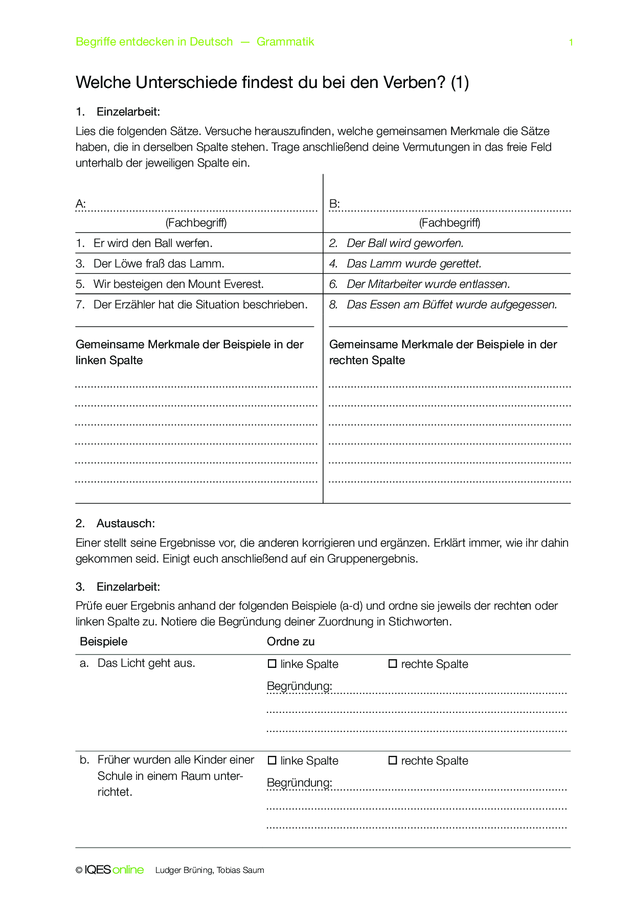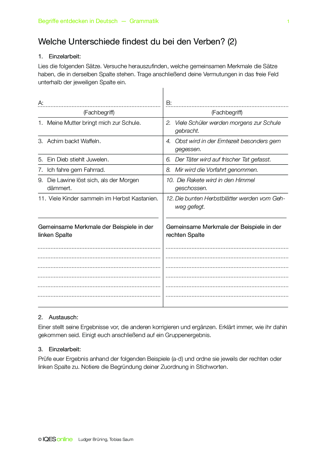 Im Concept Attainment Deutsch geht es um den Gebrauch von Aktiv und Passiv bei Verben. Das Arbeitsblatt dient dazu, zwischen den Formen unterscheiden zu lernen.