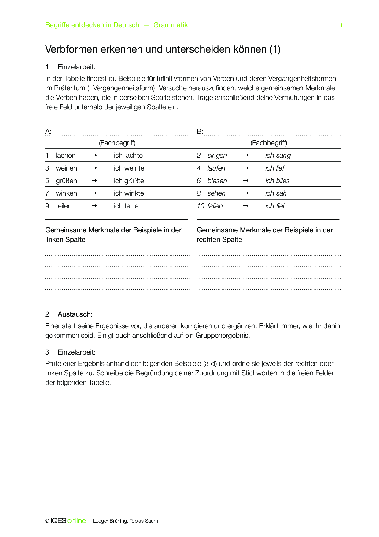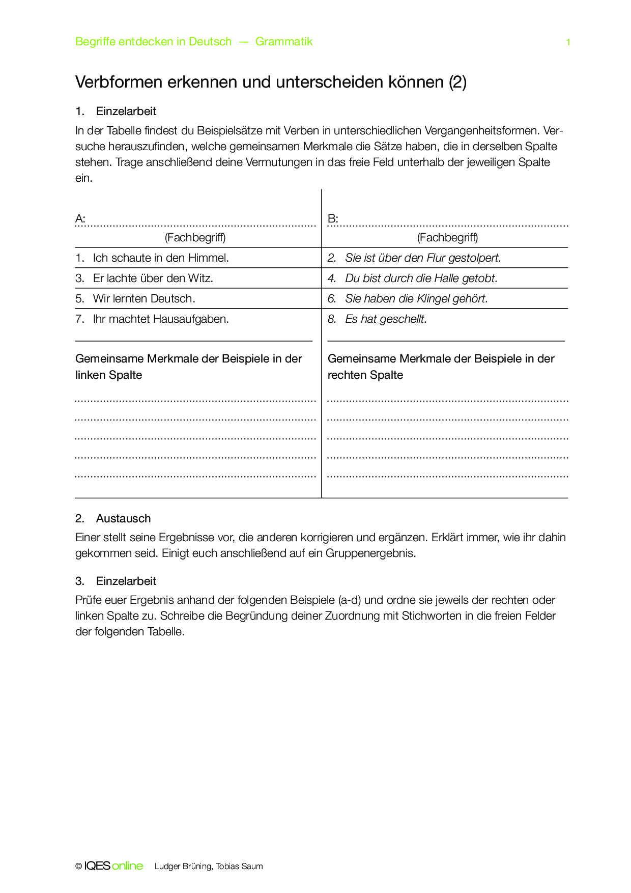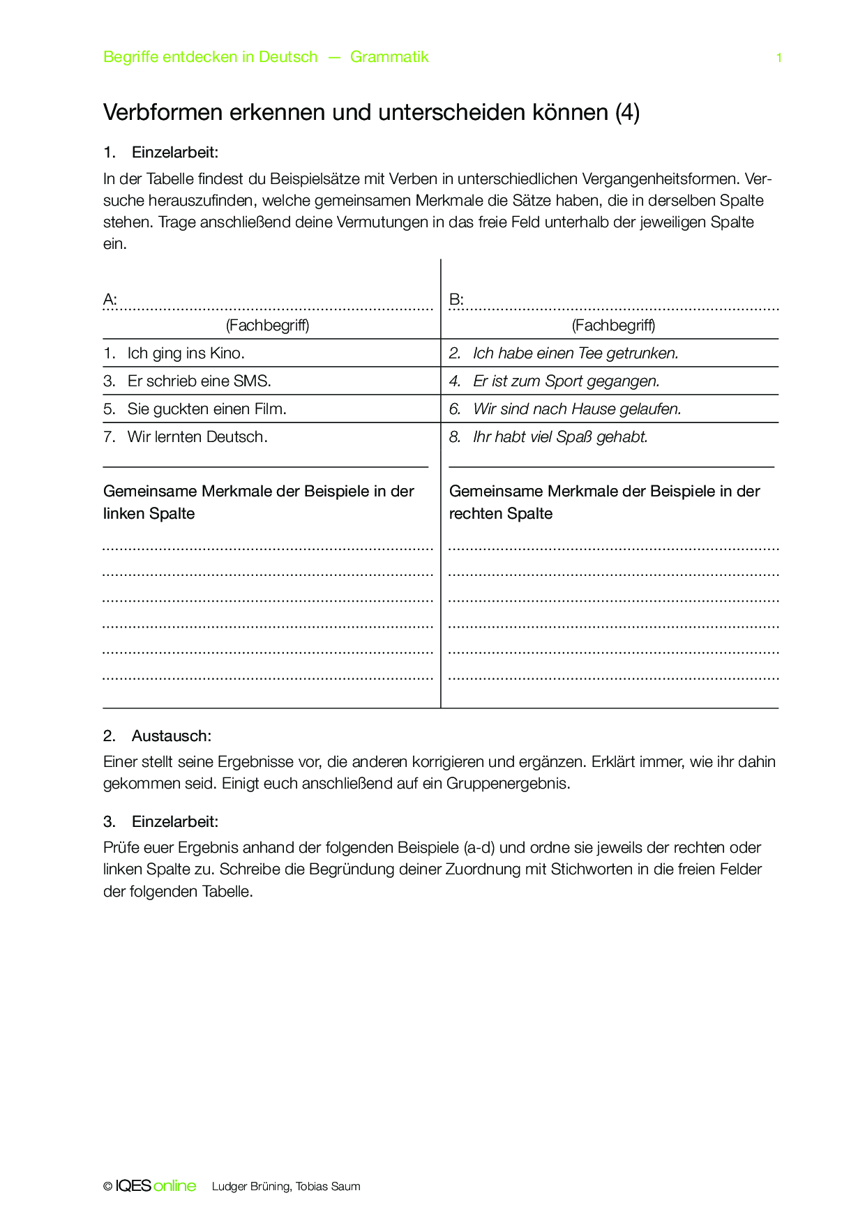 Mithilfe dieses Concept Attainment erarbeiten die Schülerinnen und Schüler den Unterschied der Vergangenheitsformen schwacher Verben im Präteritum und Perfekt. Lösungshinweise sind vorhanden.
