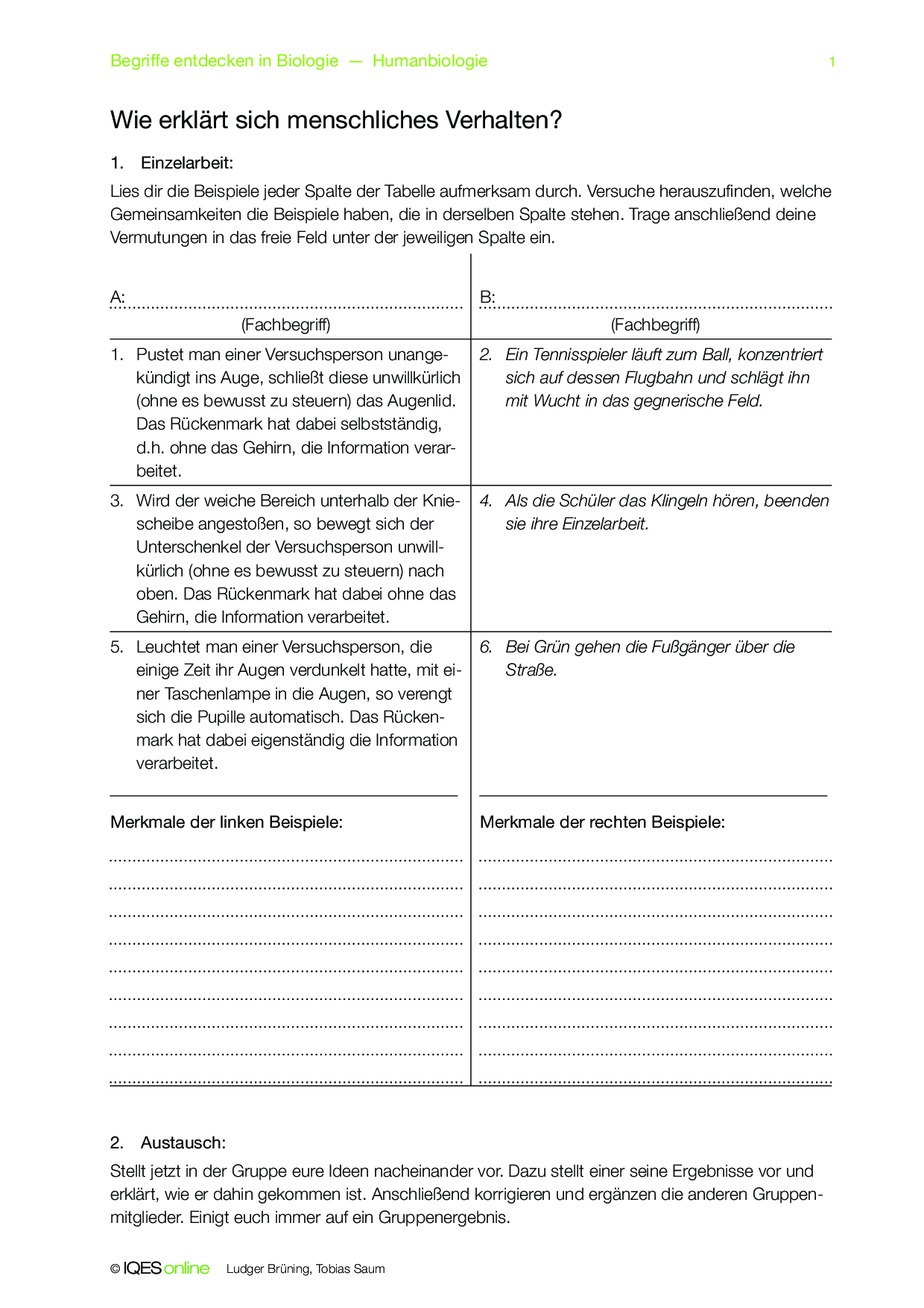 Mit diesem Concept Attainment erarbeiten die Lernenden den Unterschied zwischen Reflexen und gelerntem Verhalten. Es sind Lösungshinweise vorhanden.