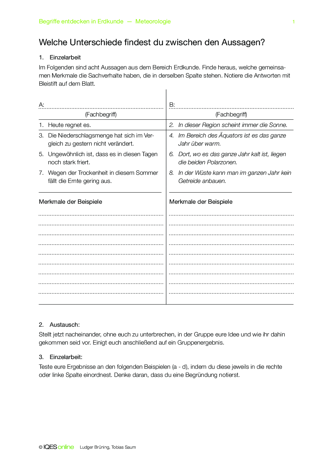 Mit diesem Concept Attainment erarbeiten die Lernenden den Unterschied zwischen Wetter und Klima. Dazu sind Lösungshinweise vorhanden.