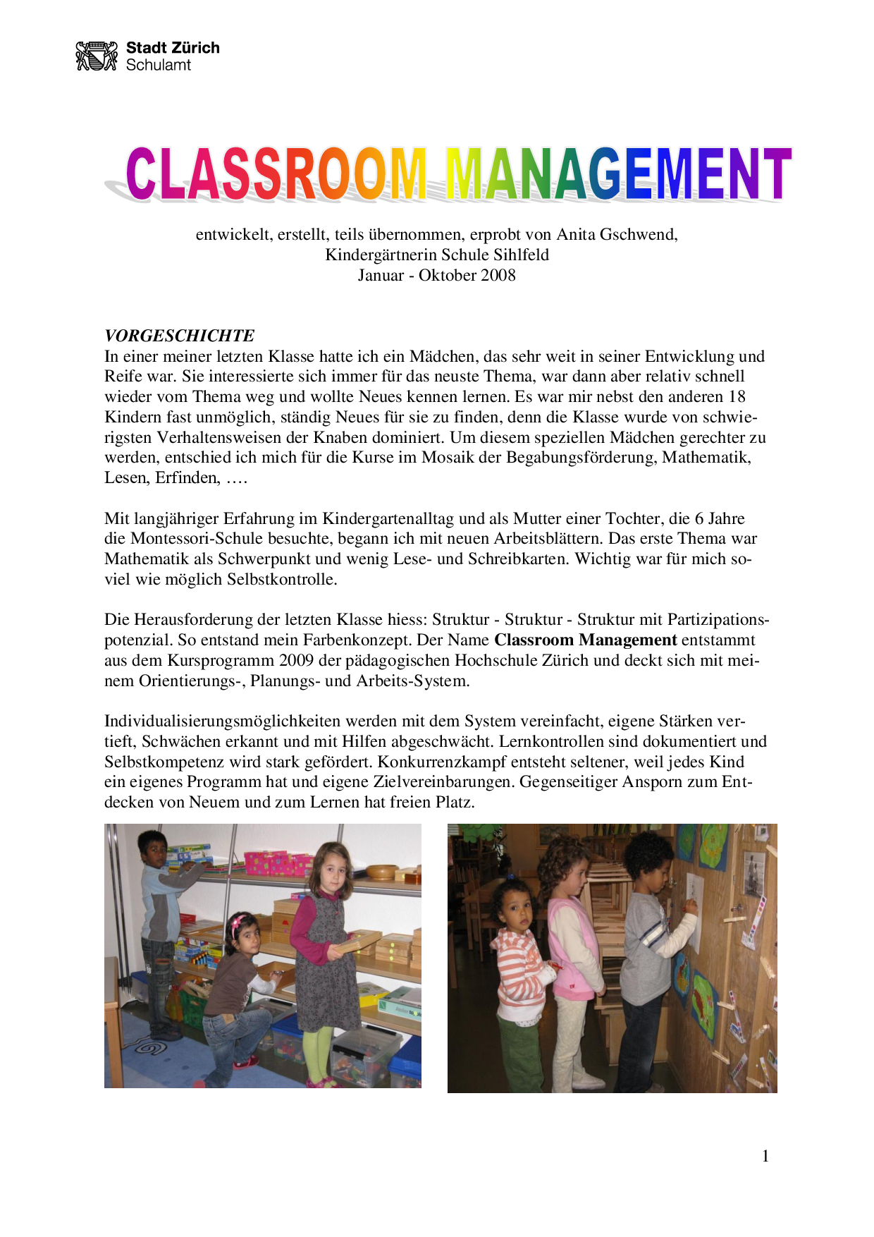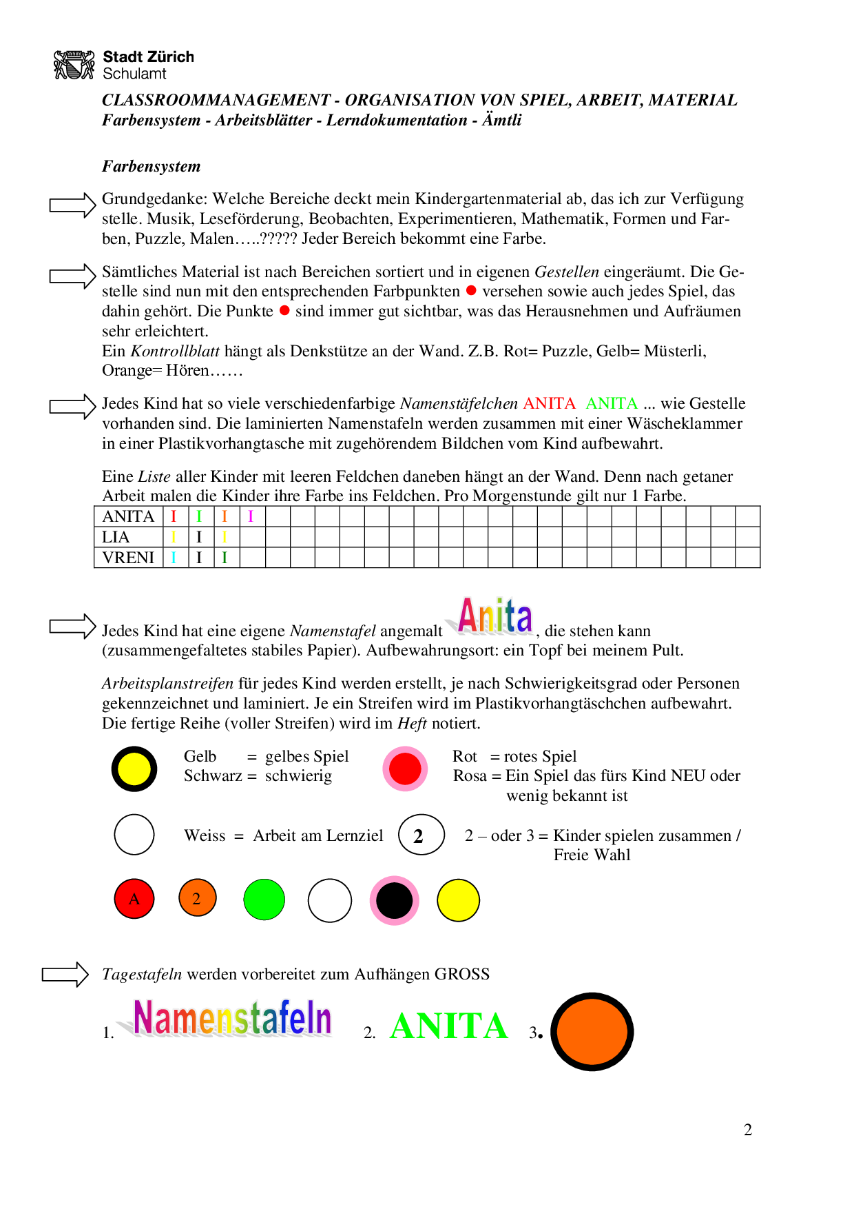 In diesem Dokument wird die Organisation des Klassenzimmers und der Arbeitsaufträge mit Hilfe von Farben vorgestellt. Dieses Konzept wurde von einer Kindergärtnerin erprobt und für Vorschule und Unterstufe entwickelt.
