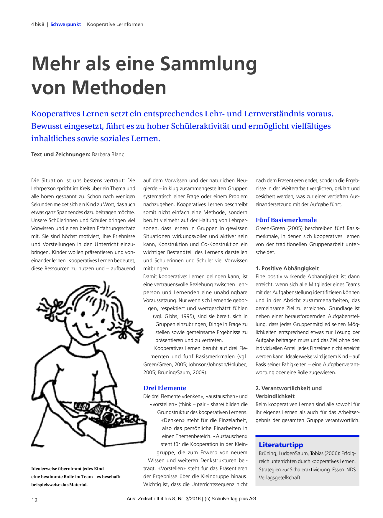 Zum kooperativen Lernen auf der Kindergartenstufe gibt es kaum Literatur. Die Zeitschrift «4 bis 8» stellt kooperative Lernformen vor, die sich sowohl im Kindergarten wie auch auf der Unterstufe umsetzen lassen. Neben einer Kurzbeschreibung der Methode erhalten Sie Hinweise zu den benötigen Materialien, einen Vorschlag zur Gruppenbildung sowie Anregungen, wie die Kinder ihre Arbeit reflektieren können. Die Arbeit in drei Phasen des kooperativen Lernens (think – pair – share) werden anhand eines konkreten Themas illustriert und beschrieben. Zusätzlich finden Sie Varianten, Vorschläge zur Differenzierung sowie Anregungen zu weiteren Themen.