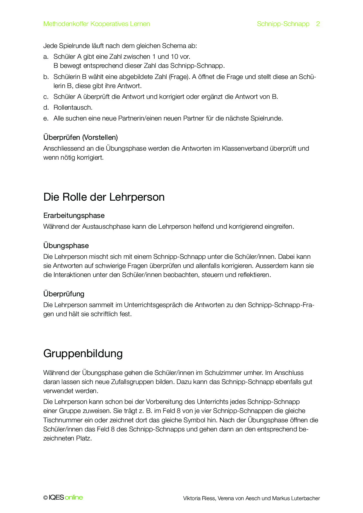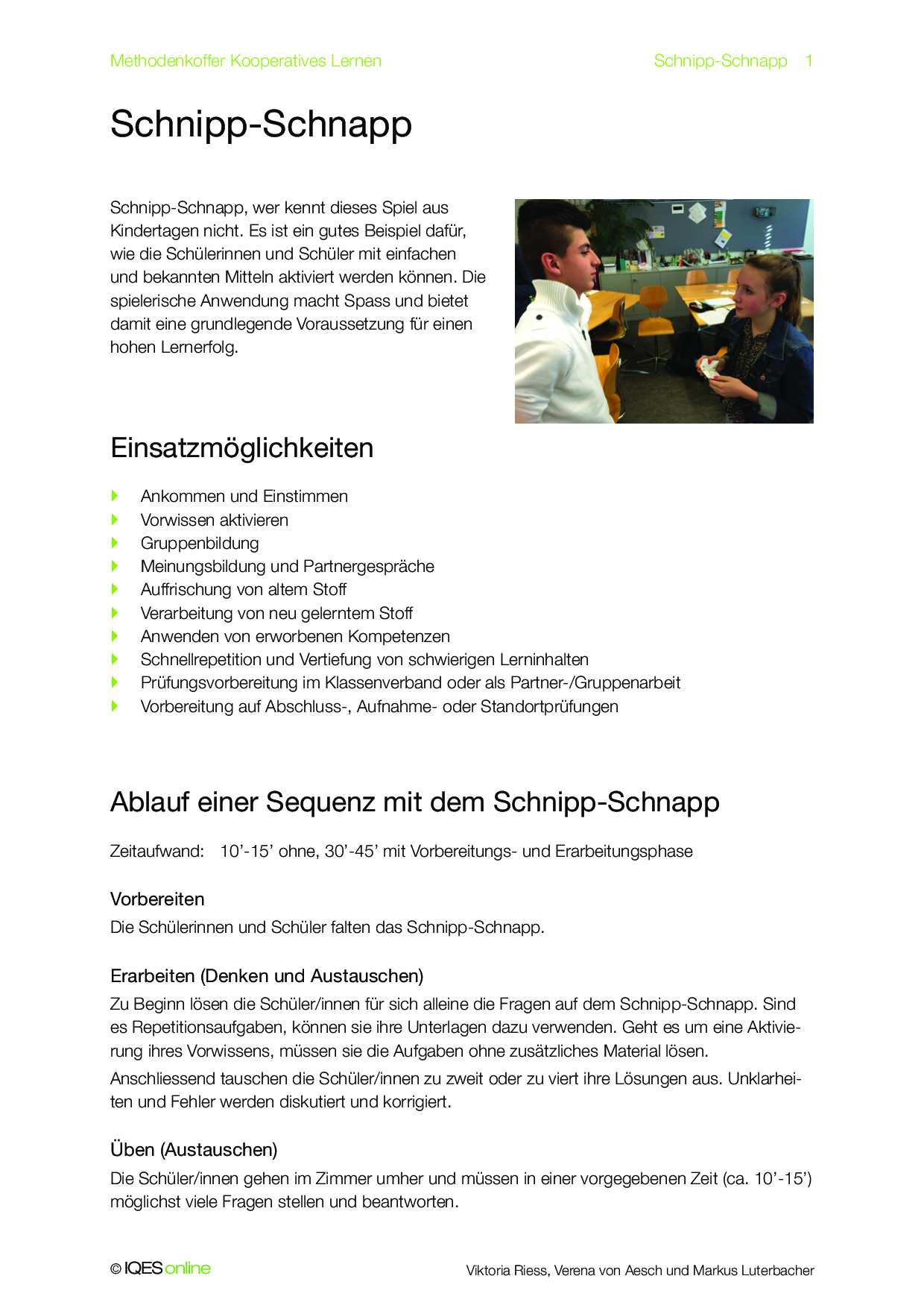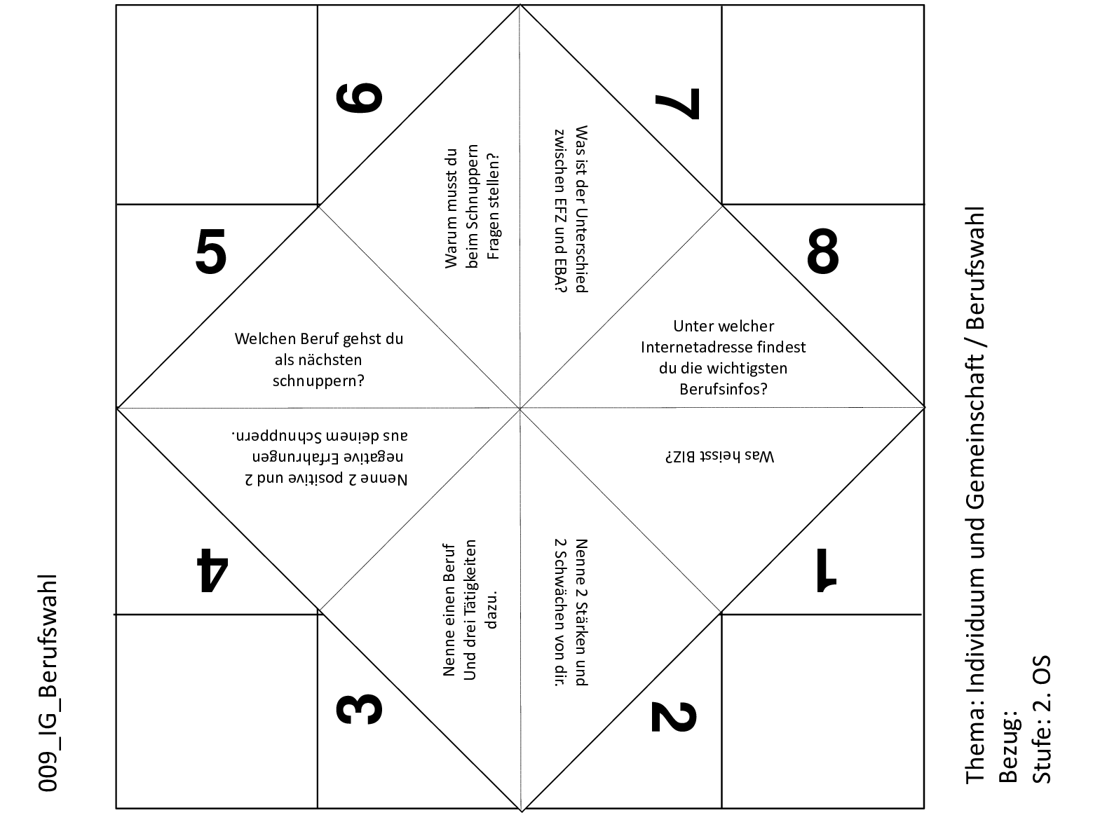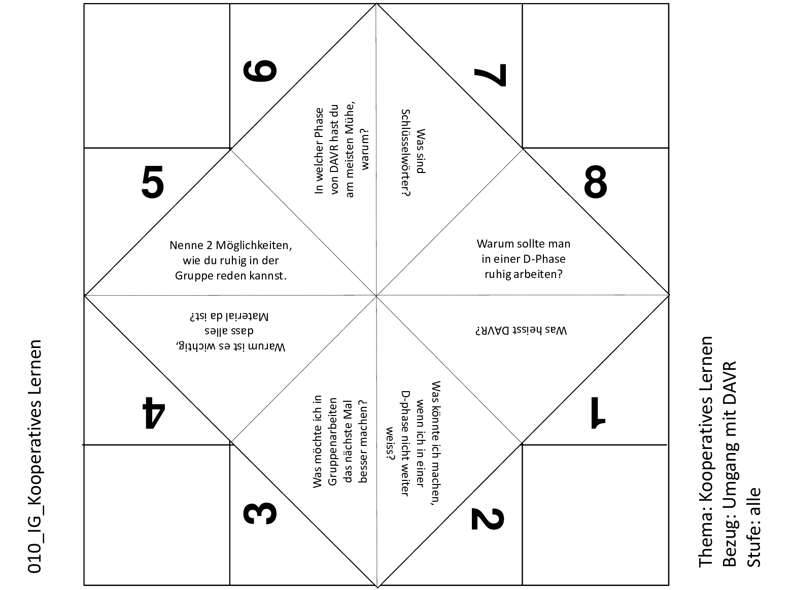 Mit diesem Schnipp-Schnapp können die Lernenden ihren Umgang mit dem Kooperativen Lernen analysieren. Es werden Reflexionsfragen zur eigenen Arbeit gestellt. Ausserdem wird der Umgang mit den einzelnen Phasen dieser Lernform thematisiert.