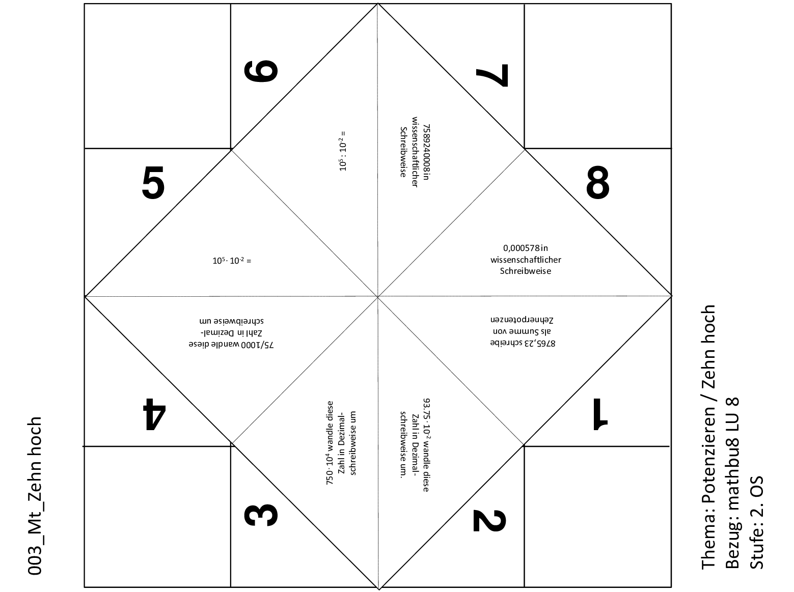 Mit diesem Schnipp-Schnapp können die Lernenden ihr Wissen über die Zehnerpotenzen überprüfen. Die Fragen drehen sich um Zahlen in wissenschaftlicher Schreibweise sowie das Darstellen, Multiplizieren und Dividieren von Zehnerpotenzen.
