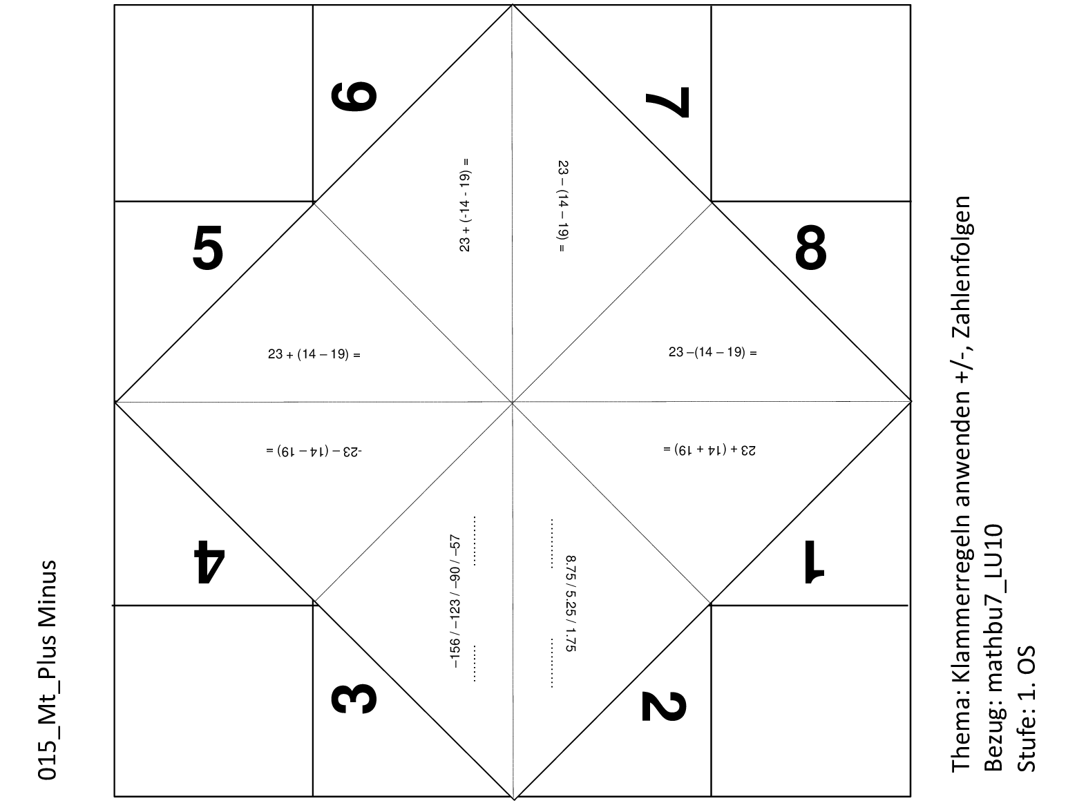 In diesem PDF finden Sie die Vorlage für ein Schnipp-Schnapp, welches im Mathematikunterricht benutzt werden kann. Die Schülerinnen und Schüler können damit den Umgang mit Plus-/Minus-Rechnungen und Klammerregeln üben.