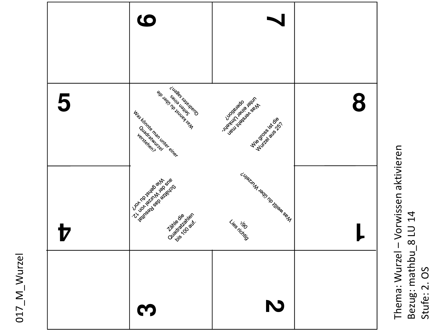 Mit diesem Schnipp-Schnapp können die Schülerinnen und Schüler ihr Vorwissen über die Wurzeln aktivieren. Dabei werden Quadratwurzeln und Quadratzahlen geübt. Ausserdem müssen die Lernenden die Wurzeln lesen und verstehen können.