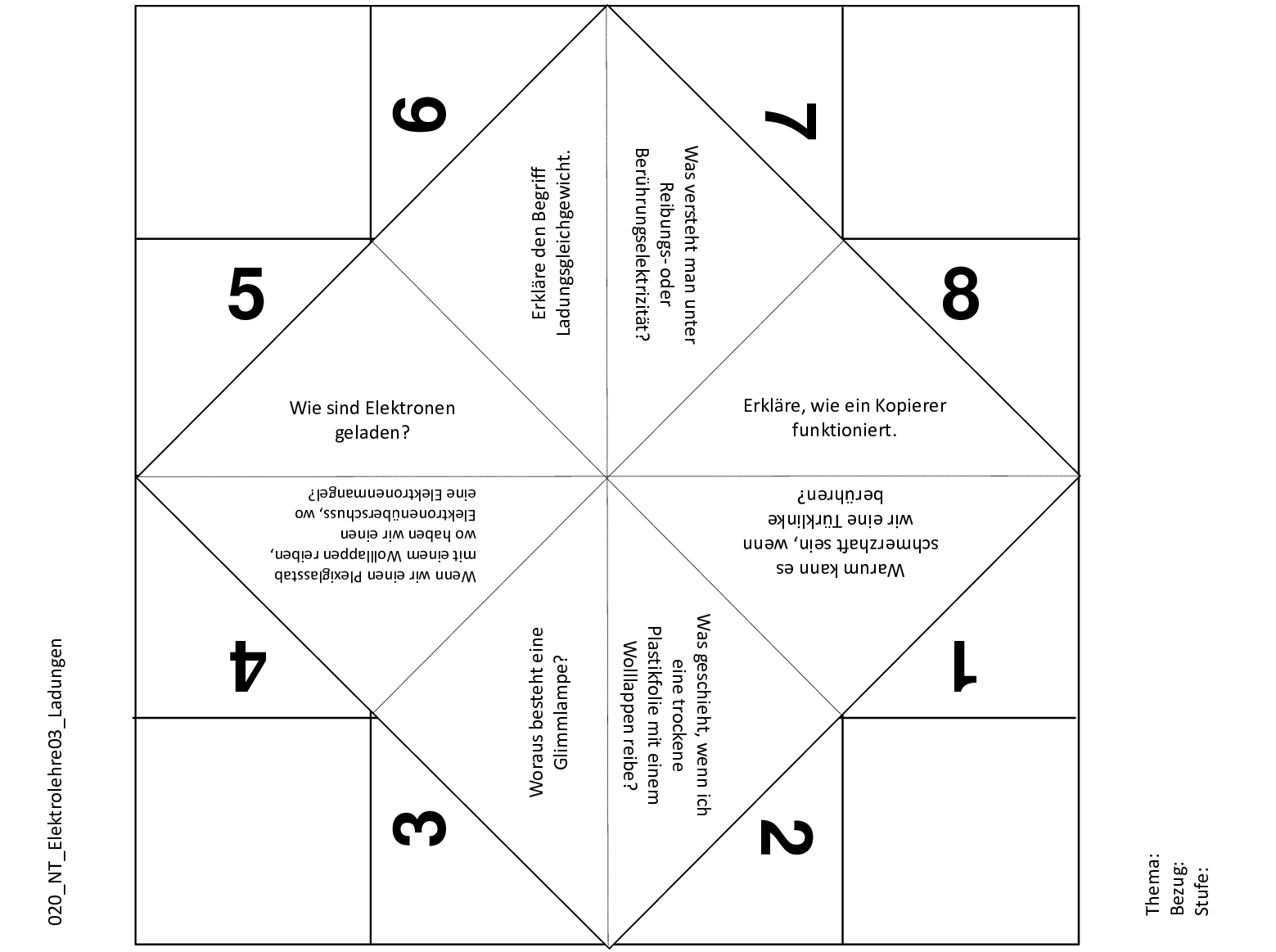Dieses Schnipp-Schnapp eignet sich für den Physikunterricht zum Thema Elektrizität. In den gestellten Fragen werden Kenntnisse über elektrische Ladungen, Glimmlampe, Elektronen, Elektronenüberschuss und Reibungsladung geprüft.