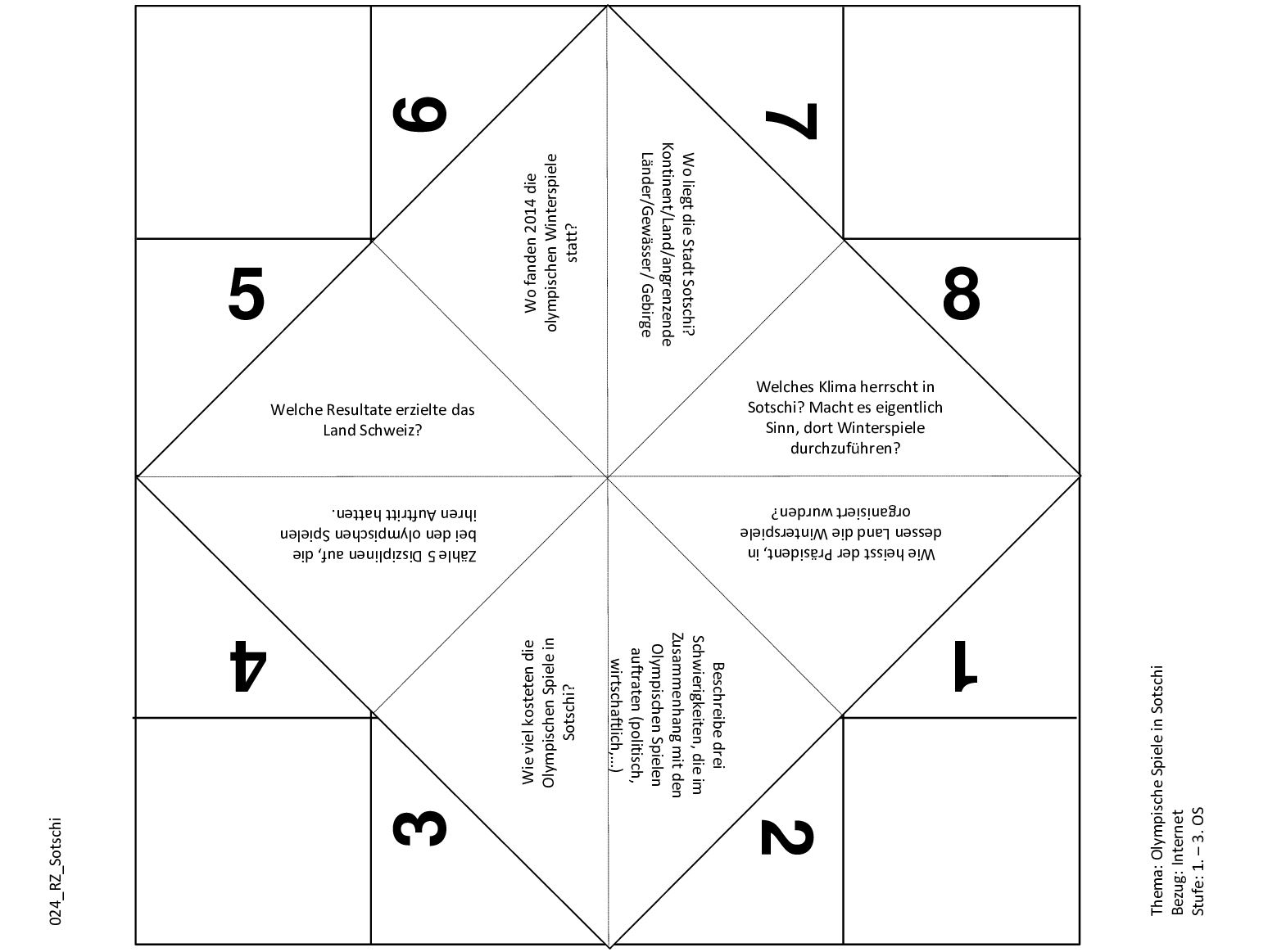 Dieses Schnipp-Schnapp kann zur Befragung über die Olympischen Spiele dienen. Die auf Sotschi abgestimmten Fragen können nach belieben angepasst und ausgetauscht werden.