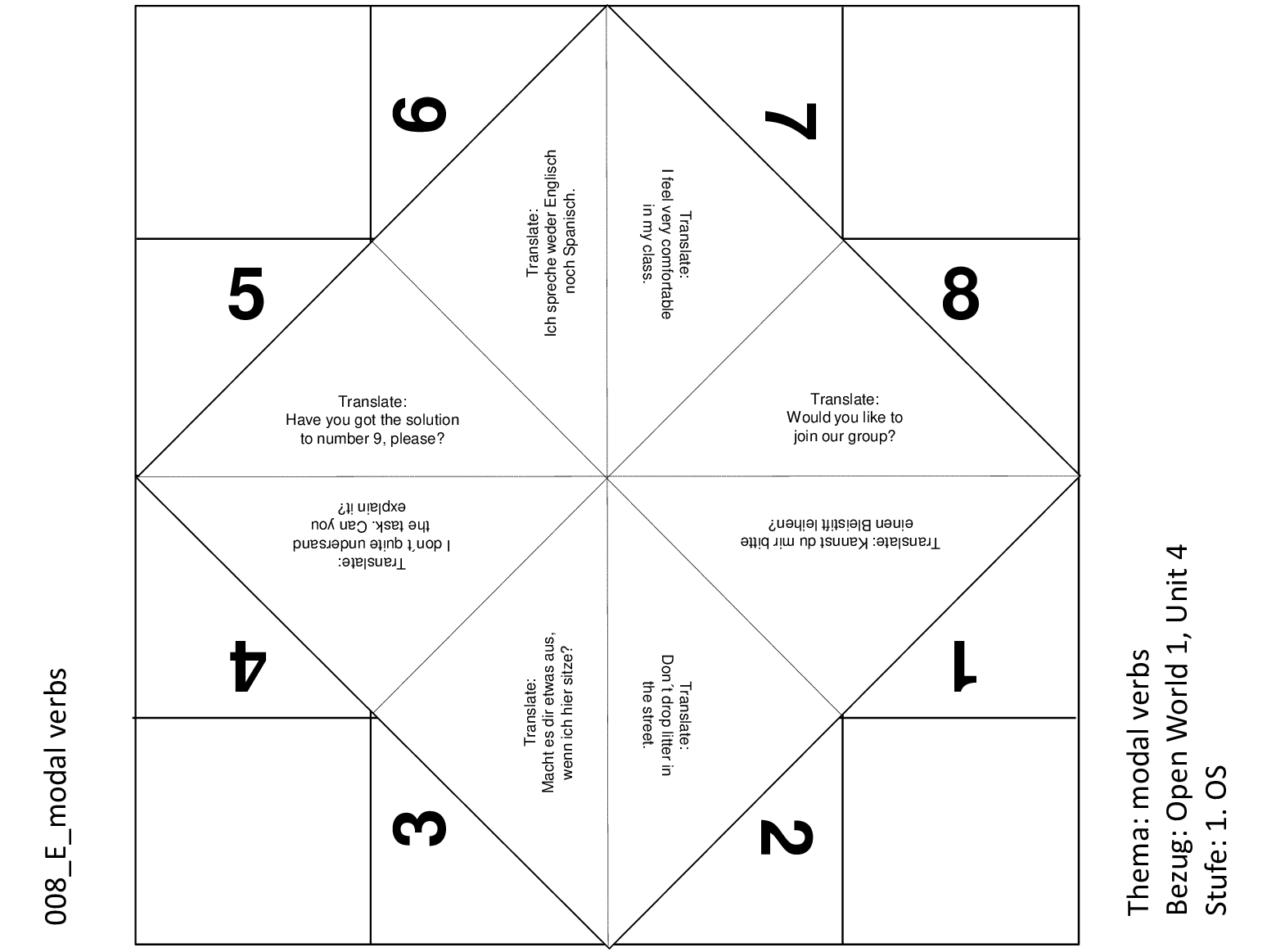Mit diesem Schnipp-Schnapp können die Lernenden ihre Übersetzungskompetenz im Englischen testen. Es geht um die korrekte Übersetzung von Sätzen mit Modalverben.