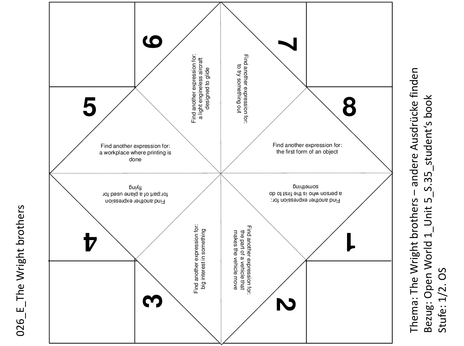 Schnipp-Schnapp für das Fach Englisch. Die Aufgabe ist, andere Ausdrücke zu finden für Begriffe im Zusammenhang mit den Wright brothers.