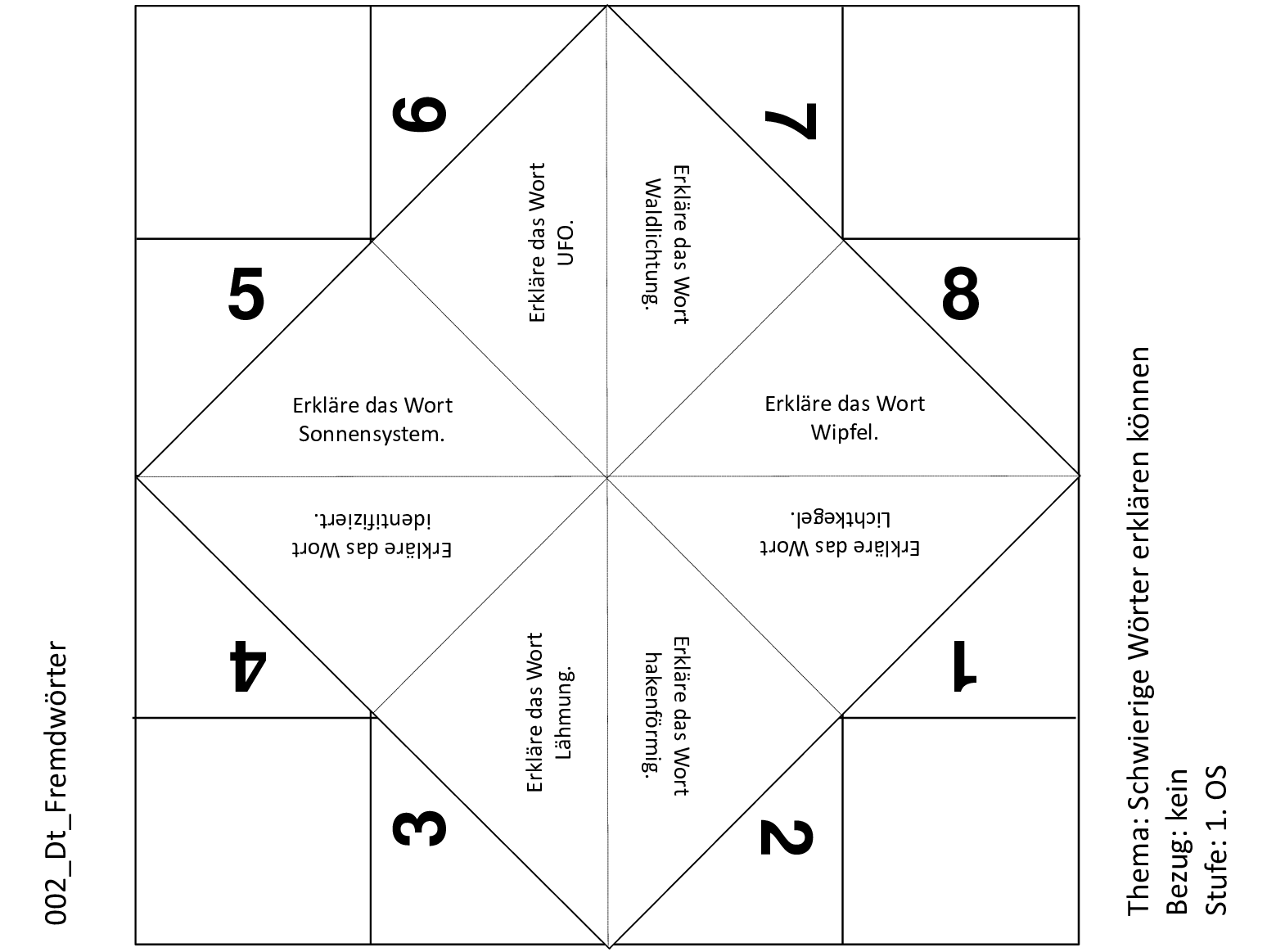 Mit dieser Schnipp-Schnapp Vorlage können die Schülerinnen und Schüler das Erklären schwieriger Wörter üben. Es werden unter anderem die Worte UFO, Sonnensystem und Wipfel abgefragt.