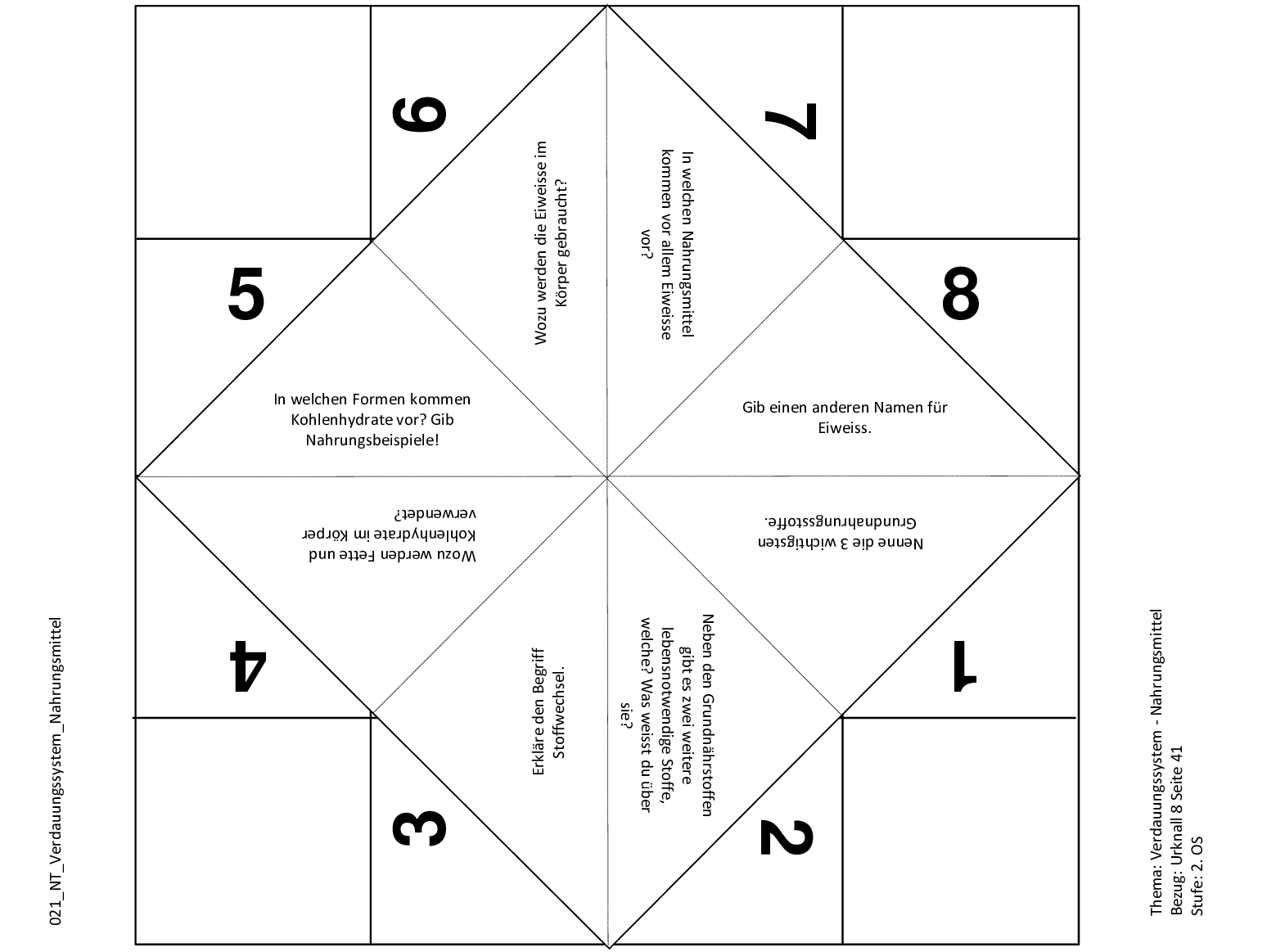 Mit diesem Schnipp-Schnapp können die Lernenden ihr Wissen über die Zusammensetzung der Grundnahrungsmittel überprüfen. Die Fragen drehen sich um Kohlenhydrate, Eiweiss, Fett, Vitamine, Mineralien sowie den Stoffwechsel.