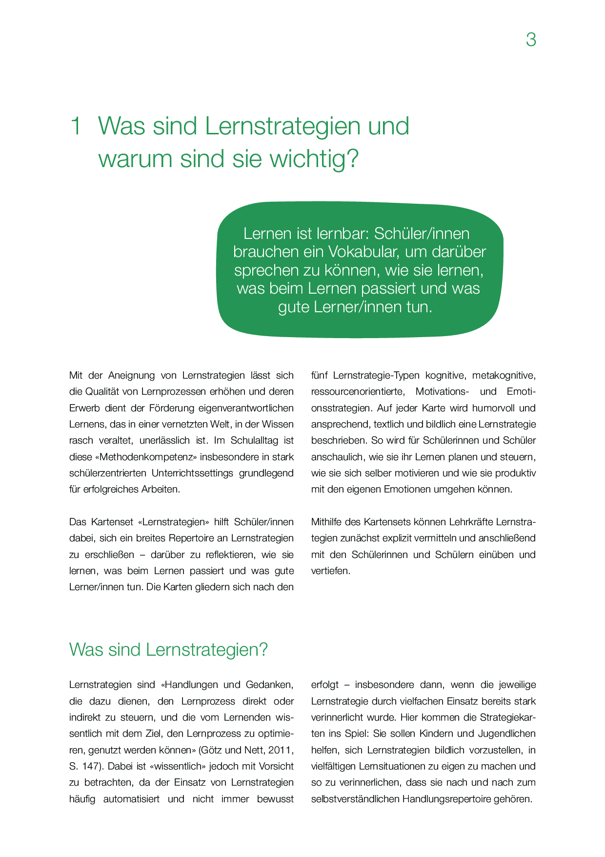 Um Schülerinnen und Schüler dabei zu helfen, eine Sprache für ihr eigenes Lernen zu entwickeln, haben wir Lernstrategie-Karten in Zusammenarbeit mit Prof. Dr. Tina Hascher und Dr. Gerda Hagenauer, Universität Bern, entwickelt. Diese machen für Schülerinnen und Schüler anschaulich, wie sie ihr Lernen planen und steuern, wie sie sich selber motivieren und wie sie produktiv mit den eigenen Emotionen umgehen können. Mit Hilfe des Kartensets können Lehrkräfte Lernstrategien zunächst explizit vermitteln und anschließend mit den Schülerinnen und Schülern einüben und vertiefen.