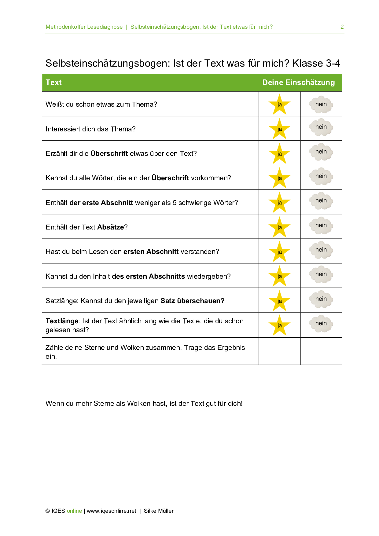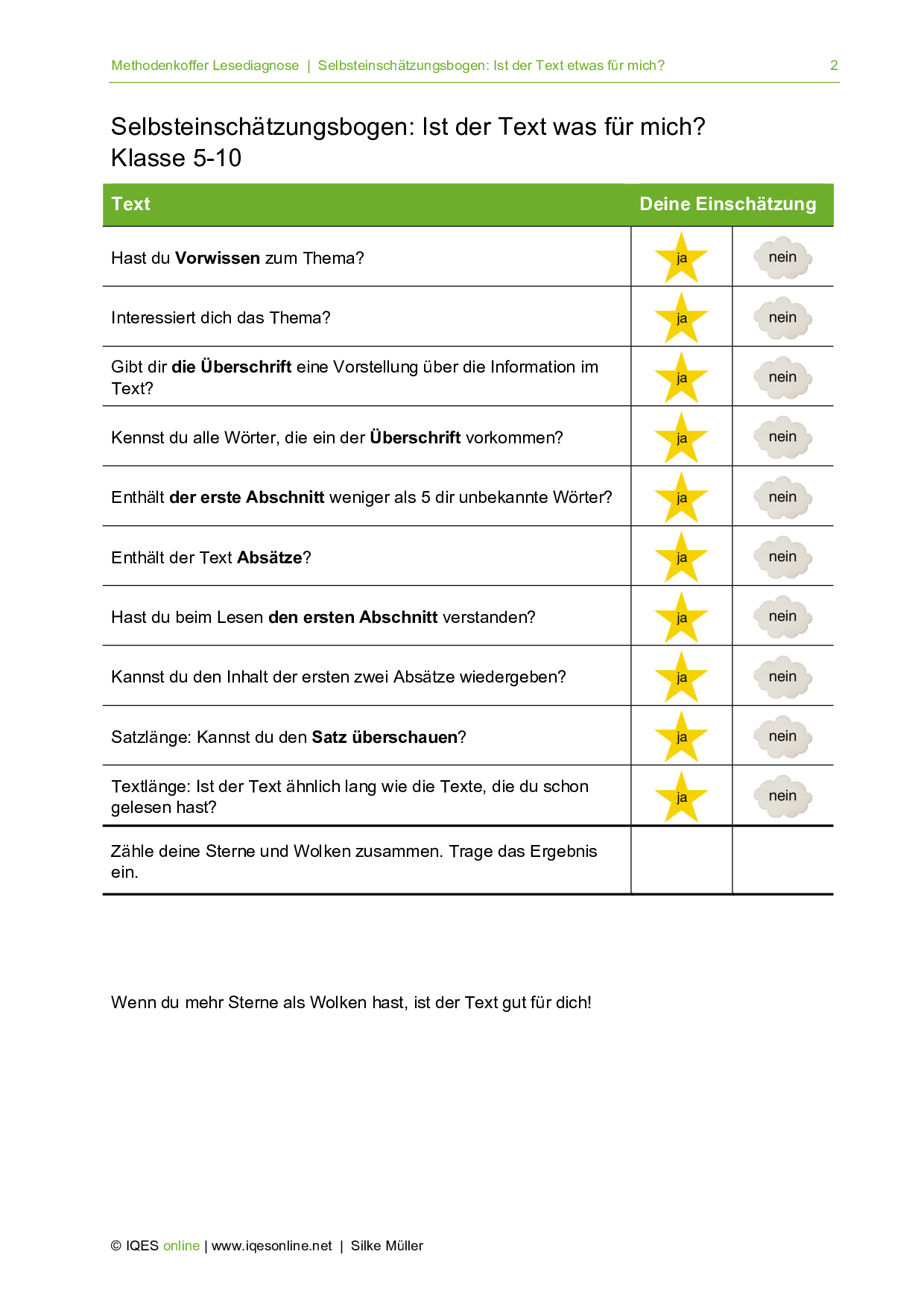 Wie gut man einen Text verstehen kann, hängt auch von den individuellen Fähigkeiten und dem vorhandenen Wissen ab. Mit diesen Selbsteinschätzungsbogen können die Schülerinnen und Schüler selber beurteilen, ob ein Text für sie geeignet ist oder nicht.